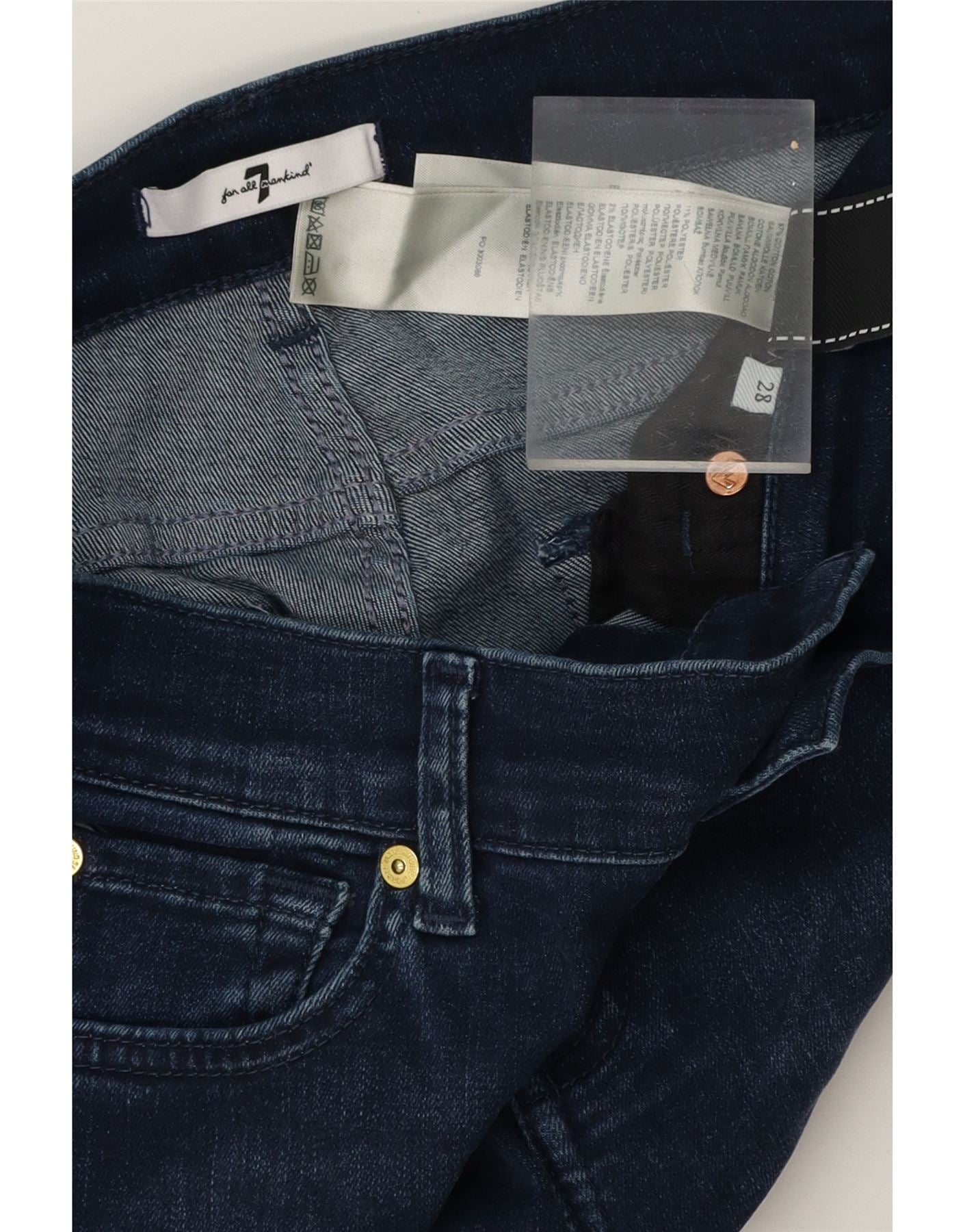 - Descrição da IA: Estes jeans bootcut 7 For All Mankind usados oferecem um estilo clássico em jeans azul. Fabricado em uma mistura de 43% algodão, 28% rayon, 27% poliéster e 2% elastano para um ajuste regular e confortável. As características incluem fecho de botão e bolsos práticos. Embora esteja em excelente estado, há pequenas descolorações na frente e nas costas e desgaste visível na cintura. Lavável na máquina. Tamanho 28.