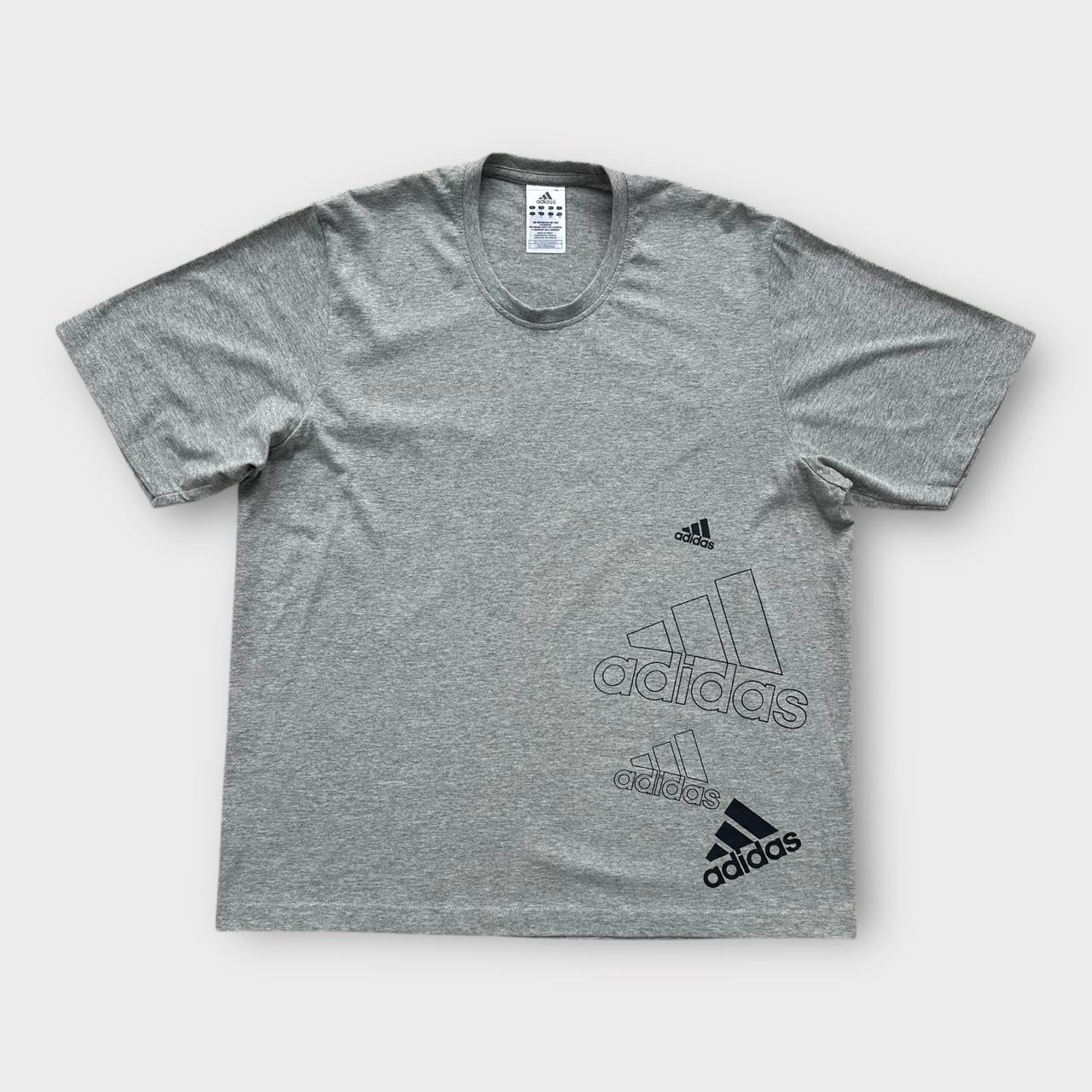 Camiseta gráfica Adidas do início dos anos 2000 em cinza com logotipos no peito e nas costas