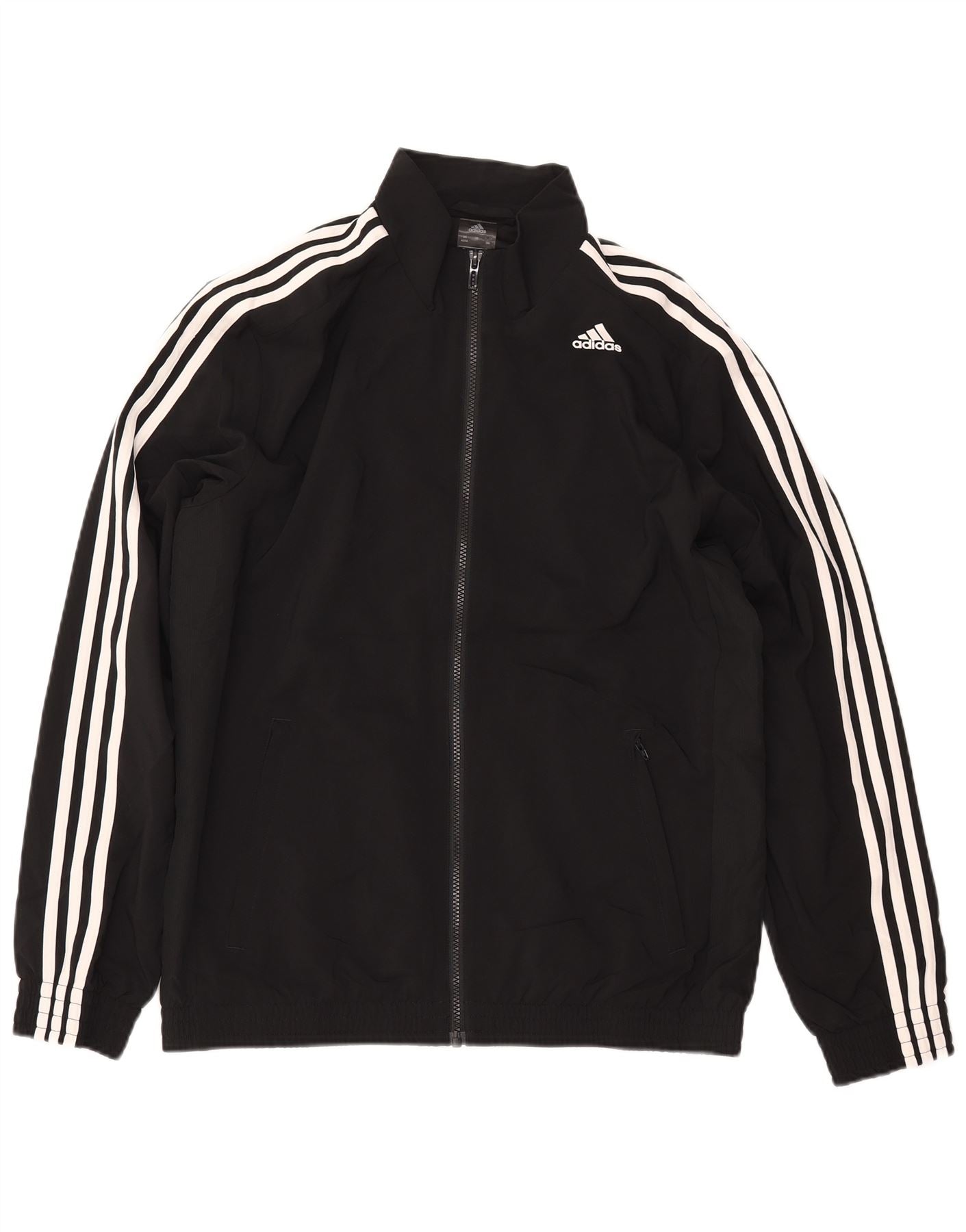- Descrição da IA: Esta jaqueta masculina Adidas é confeccionada em poliéster tecido preto, oferecendo um acabamento macio e respirável. Possui decote com gola e fecho de correr completo para uso versátil. Mangas compridas proporcionam ampla cobertura. Listras brancas clássicas adornam as mangas, adicionando um toque icônico. Um logotipo sutil da Adidas está presente. O ajuste regular garante movimentos confortáveis.