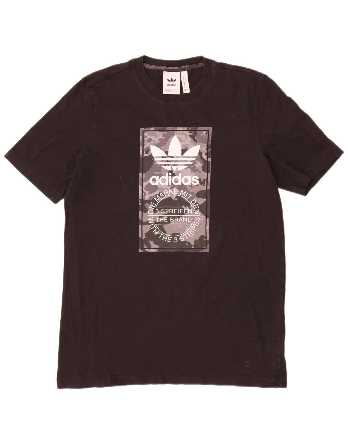 - Descrição da IA: Esta camiseta gráfica masculina da Adidas é confeccionada em jersey de algodão preto macio. Possui gola redonda clássica e mangas curtas. A frente apresenta um gráfico de camuflagem distinto com o icônico logotipo da Adidas. Seu ajuste regular garante conforto e uma silhueta versátil. Este pulôver leve oferece um estilo moderno e casual.