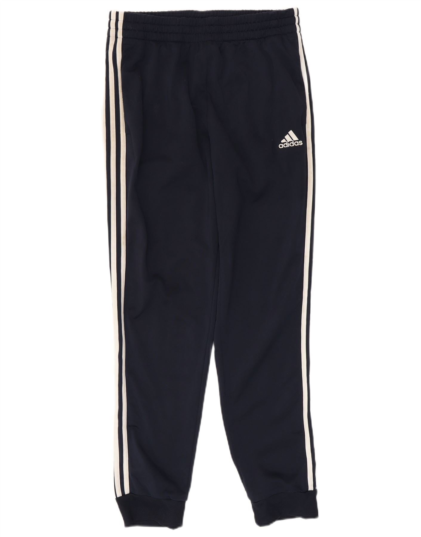 - Descrição da IA: As calças esportivas masculinas da Adidas são confeccionadas em tecido liso de malha de poliéster azul marinho. Eles apresentam uma cintura elástica confortável e um ajuste regular. As pernas se estreitam até os tornozelos algemados. Três listras brancas clássicas percorrem cada lado. Um logotipo sutil da Adidas é colocado na coxa. Bolsos práticos estão incluídos. Este design oferece estilo e conforto para uso ativo.