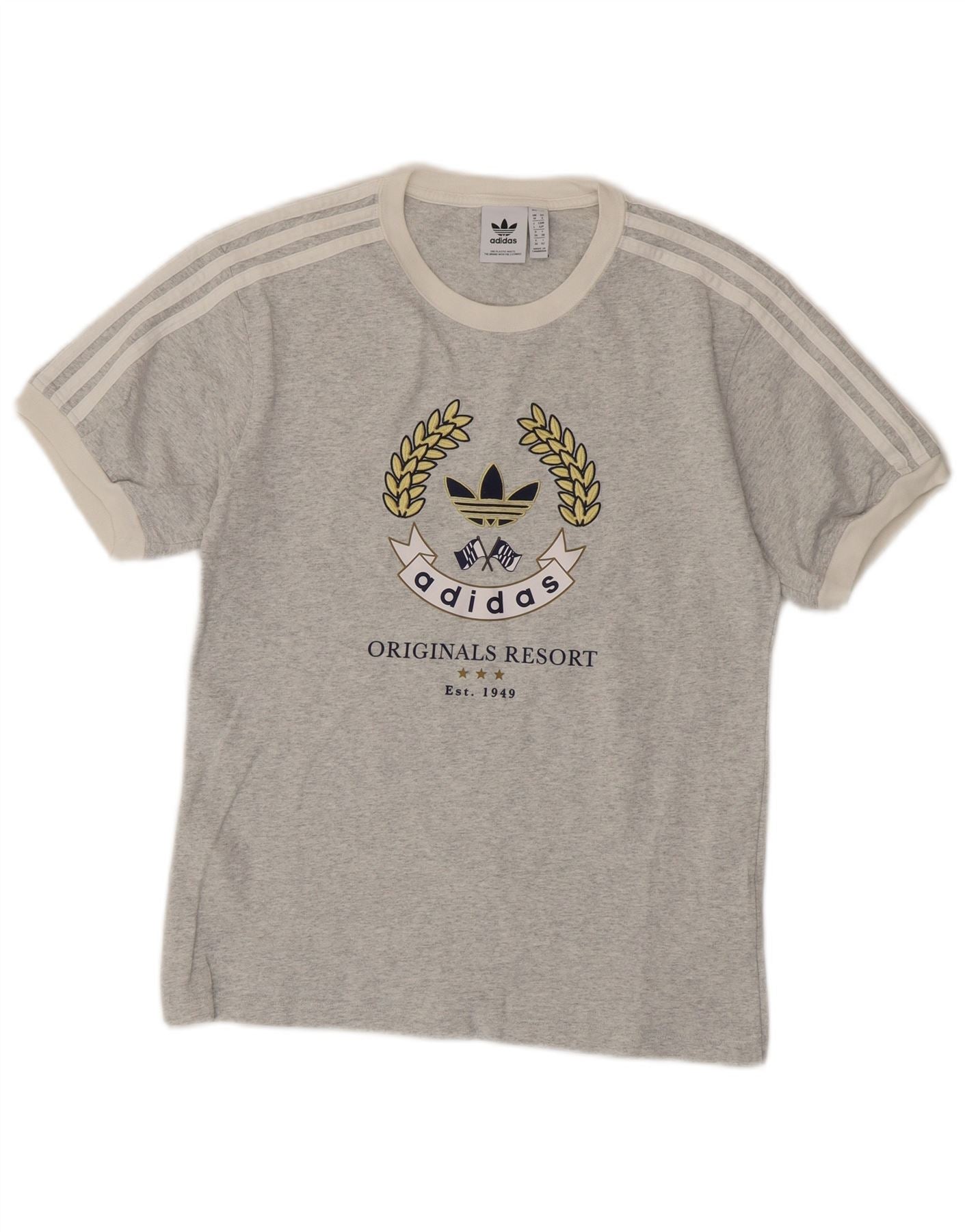 - Descrição da IA: Esta camiseta feminina com estampa da Adidas é confeccionada em jersey de algodão cinza macio. Possui gola redonda clássica e mangas curtas com três listras esbranquiçadas distintas. A frente apresenta um logotipo gráfico detalhado do Adidas Originals Resort. Seu ajuste regular garante conforto e uma silhueta relaxada. Este estilo pulôver oferece uma adição leve e versátil a qualquer guarda-roupa casual.