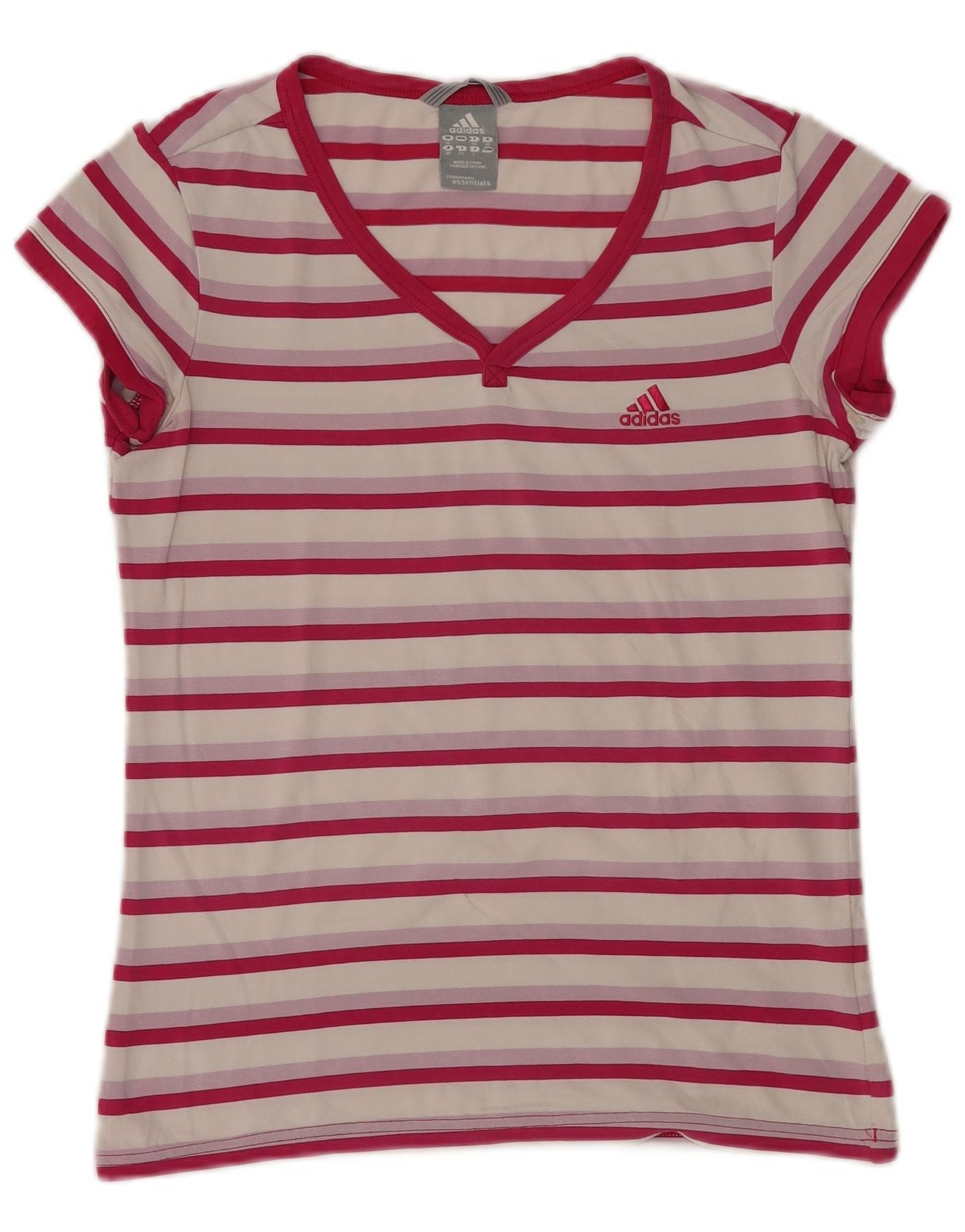 - Descrição da IA: Esta camiseta feminina Adidas é confeccionada em tecido jersey macio, oferecendo uma sensação confortável e respirável. Possui decote em V lisonjeiro e mangas curtas. O design apresenta um padrão listrado clássico em rosa e branco. Um logotipo sutil da Adidas adiciona um toque exclusivo. Seu ajuste regular garante facilidade de movimento, tornando-o ideal para esportes ou uso casual. Este estilo pulôver combina desempenho com conforto no dia a dia.