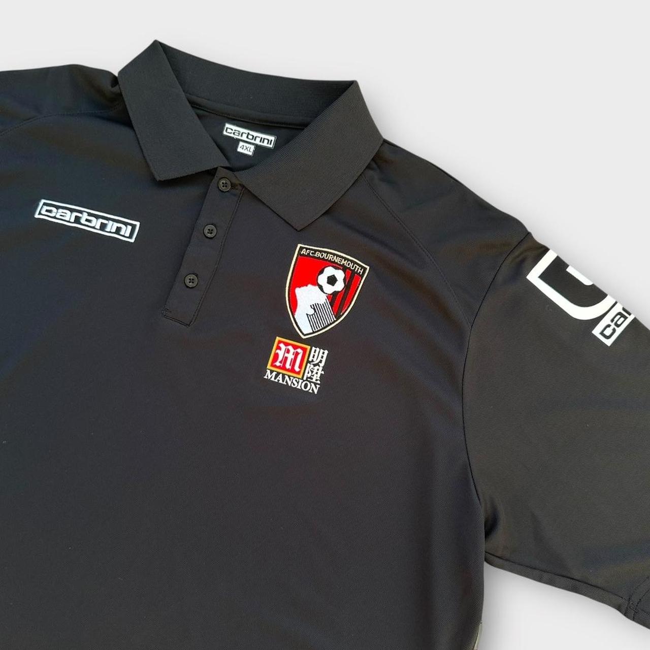 Camisa polo de futebol de aquecimento do AFC Bournemouth em preto com patrocinadores e logotipos por toda parte