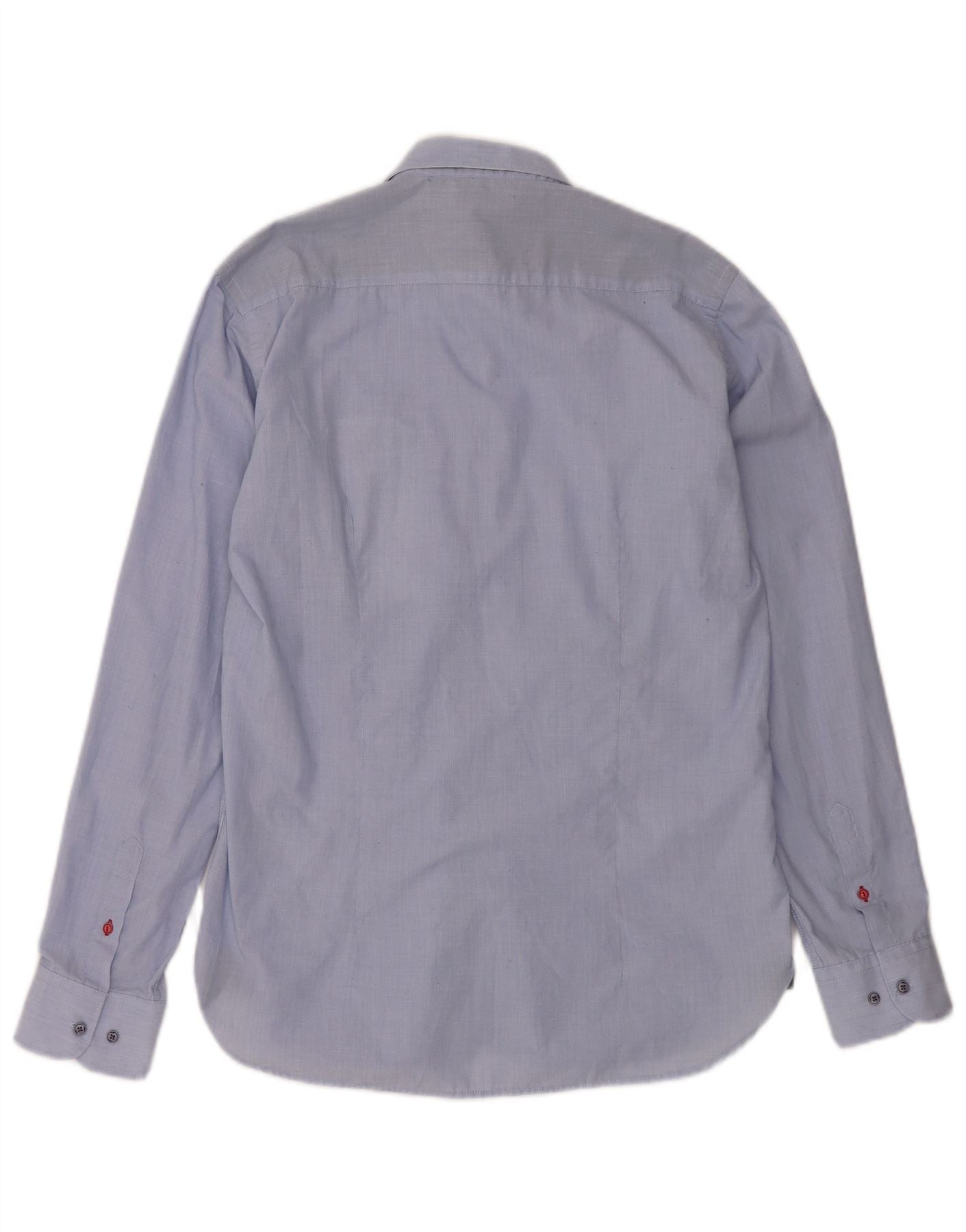- Descrição da IA: Esta camisa masculina vintage é confeccionada em tecido azul mesclado, uma mistura suave de poliéster e algodão. Possui decote clássico com gola e mangas compridas. O botão frontal e o corte regular oferecem uma silhueta atemporal. Um bolso sutil no peito acrescenta detalhes práticos. Botões tonais completam o visual refinado.