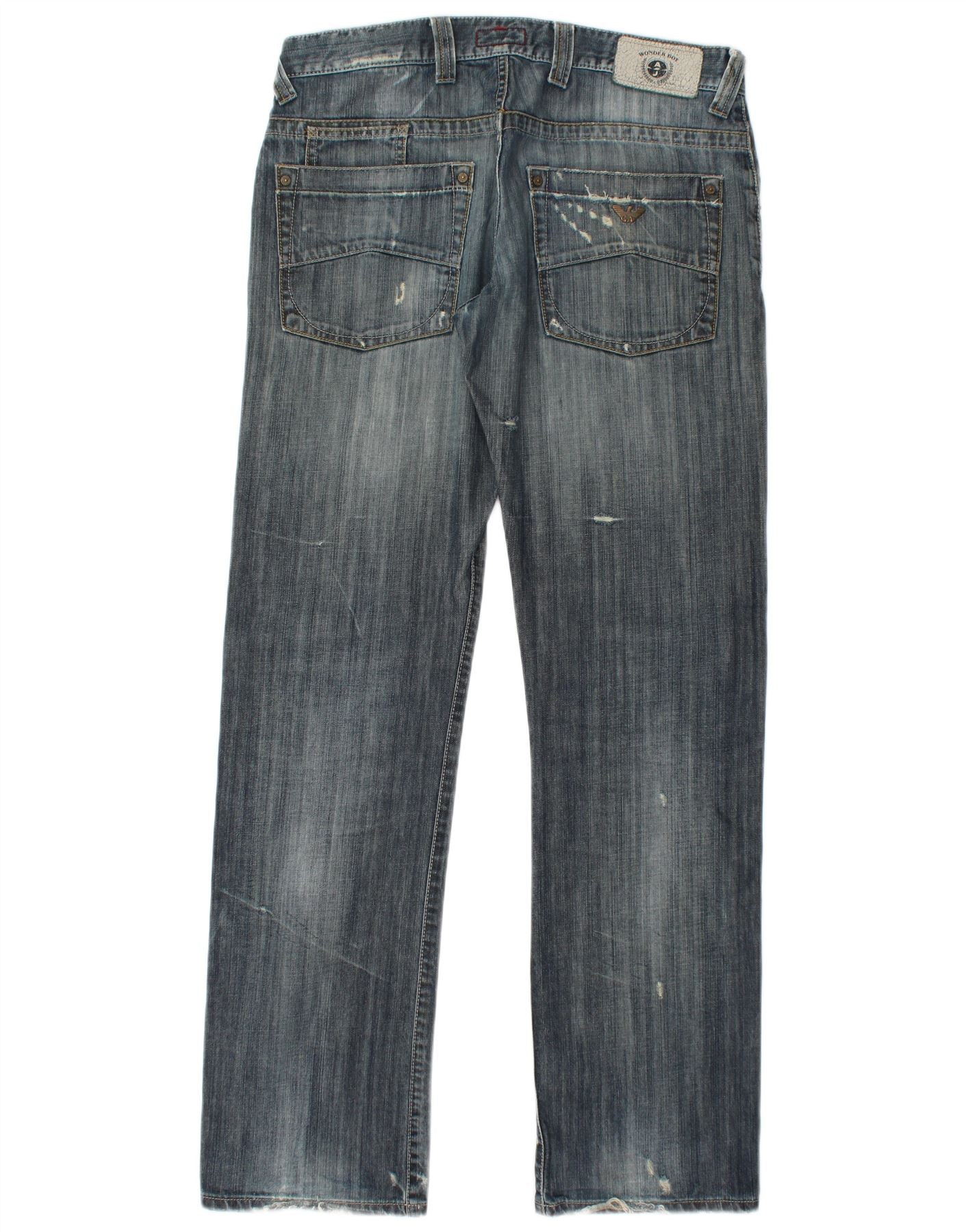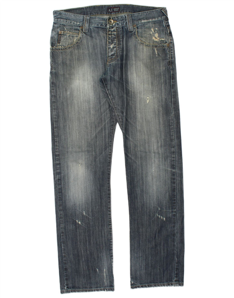 - Descrição da IA: Estes jeans retos masculinos da Armani Jeans são confeccionados em jeans azul com acabamento desgastado. Apresentam um corte regular, oferecendo uma silhueta confortável e clássica. O design de perna reta garante uma aparência atemporal. Um fecho de botão protege a frente, complementado por bolsos práticos. O estilo retro adiciona um toque distinto.