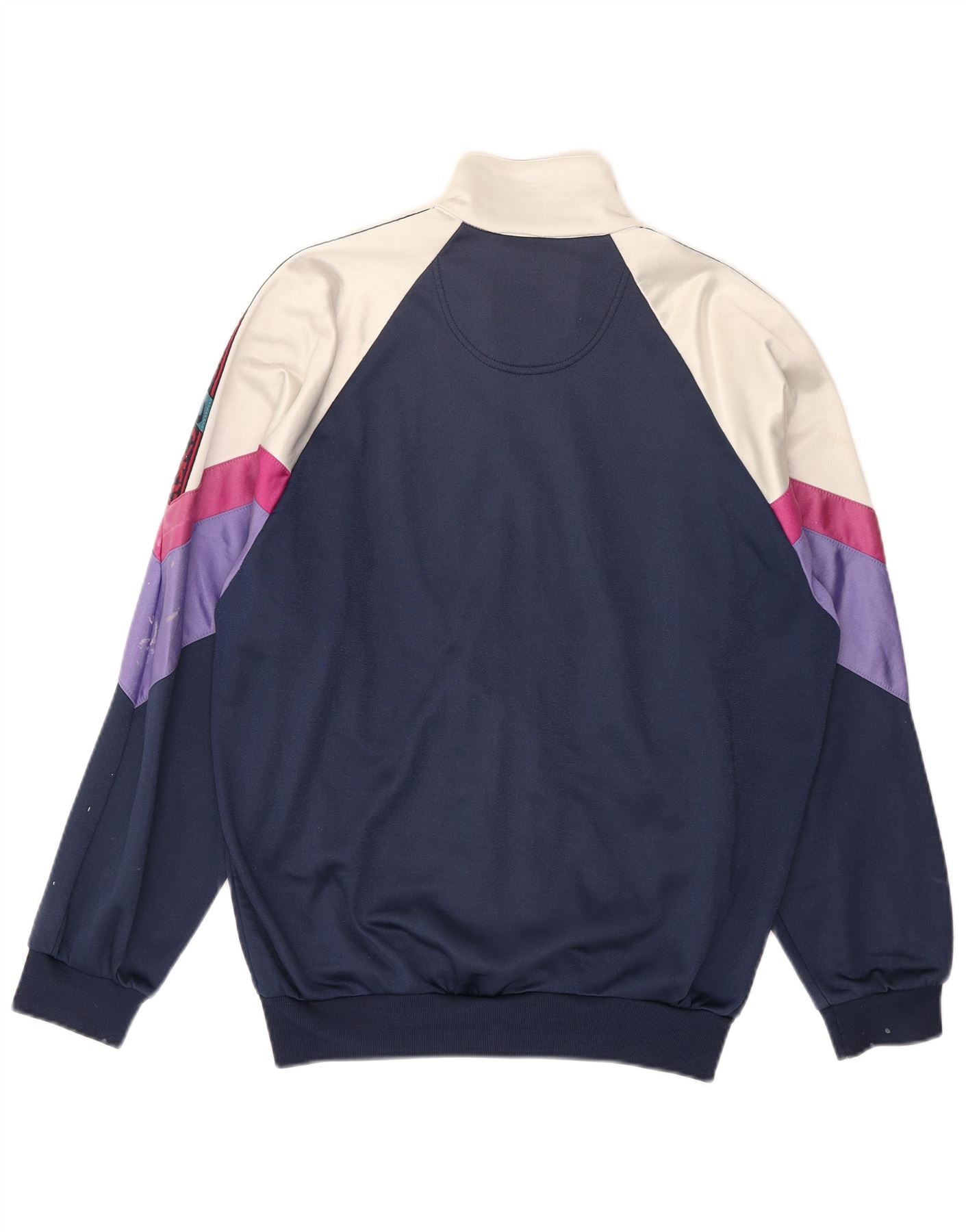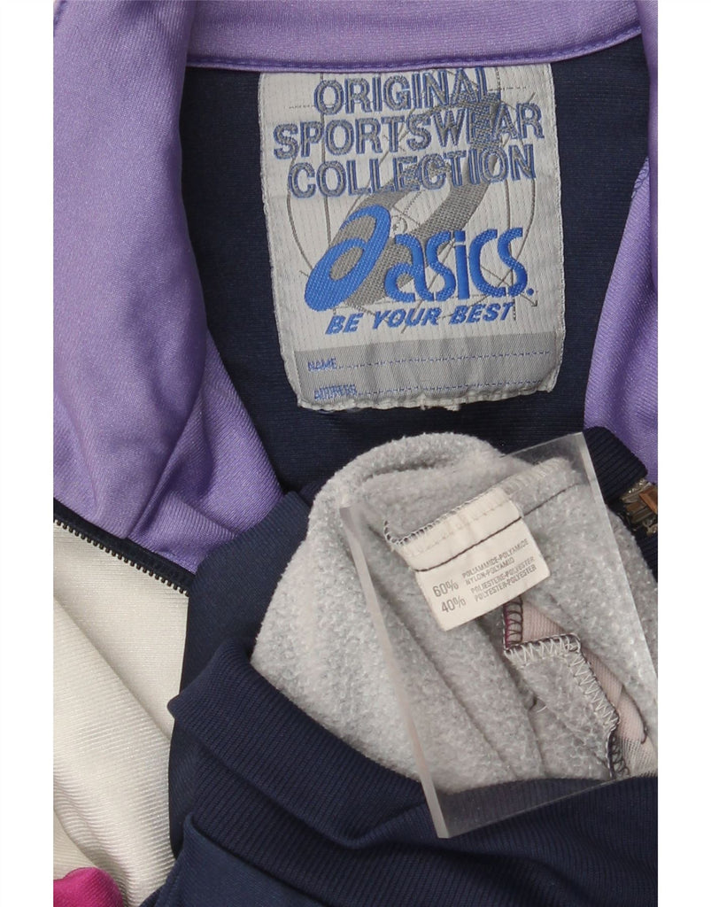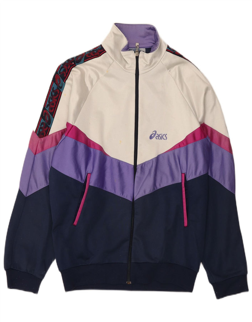 - AI Description: This Asics mens tracksuit top jacket is crafted from a durable polyamide blend, offering a smooth, lightweight feel. It features a striking multicoloured colourblock design, combining navy blue, white, and purple. The collared neckline and full zip closure provide classic structure. Long sleeves and a regular fit ensure comfortable wear. Practical pockets add functionality. A subtle logo accent completes the retro style.