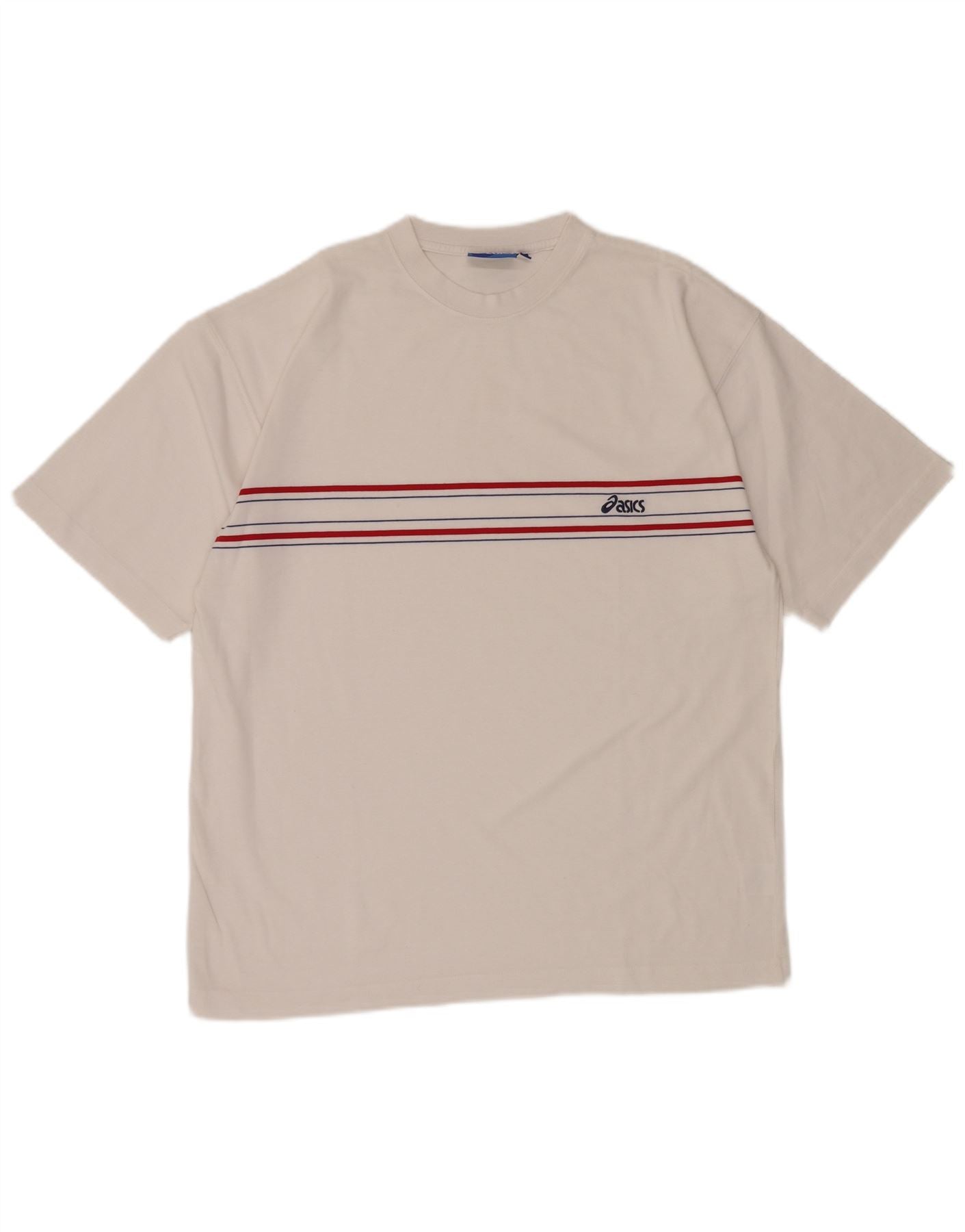 Home > Roupas vintage Asics > Roupas masculinas vintage Asics > Camisetas > Camiseta masculina ASICS grande poliéster listrado branco