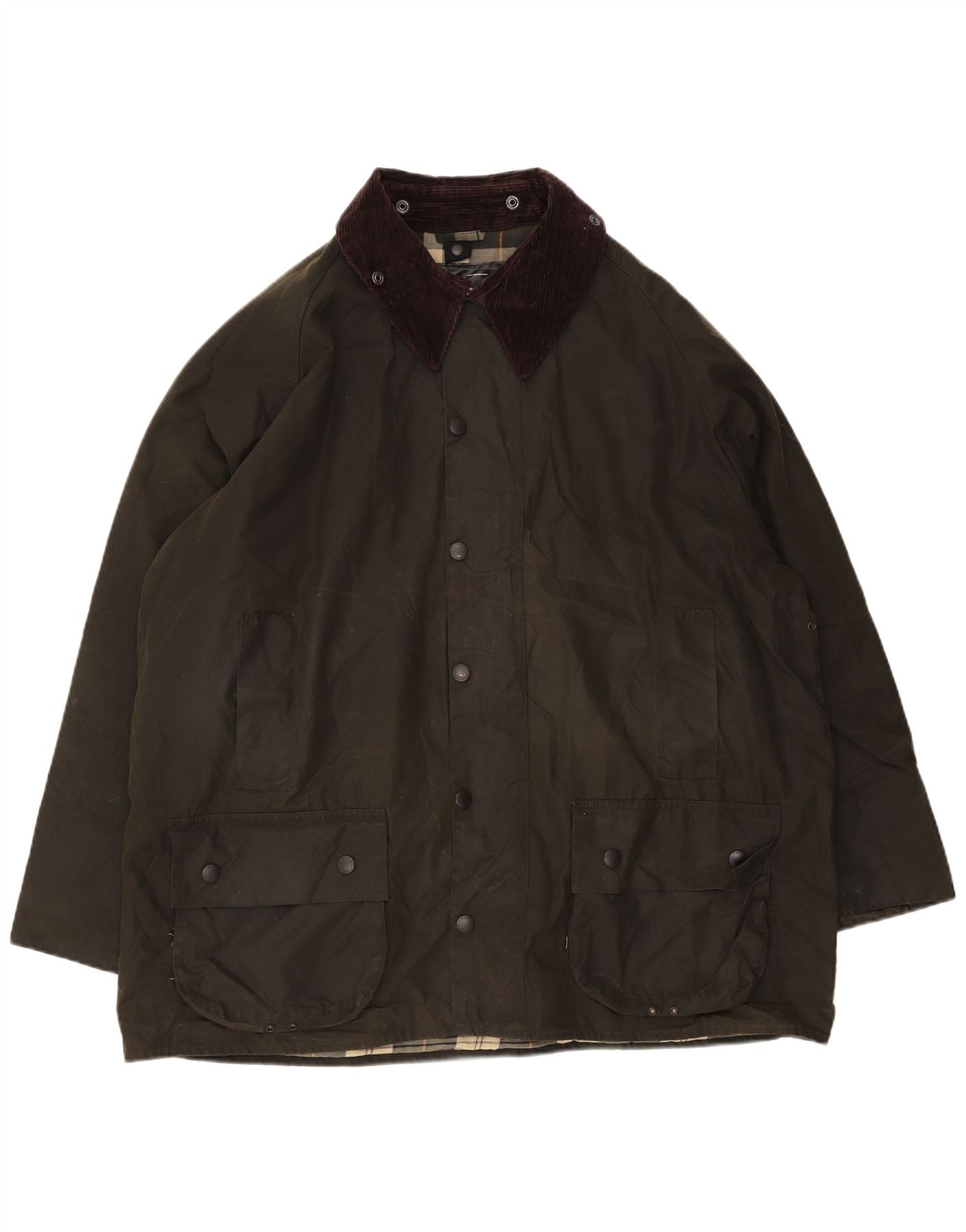 - Descrição da IA: Esta jaqueta masculina de algodão encerado Barbour é confeccionada em algodão encerado verde durável, oferecendo resistência à água. Possui uma gola de veludo cotelê distinta em tom contrastante. O clássico decote com gola e mangas compridas proporcionam uma silhueta atemporal. Um fecho de botão completo protege a frente. Vários bolsos utilitários melhoram seu design prático. O ajuste regular garante um uso confortável. Os botões tonais servem como um destaque sutil, complementando a estética geral robusta.