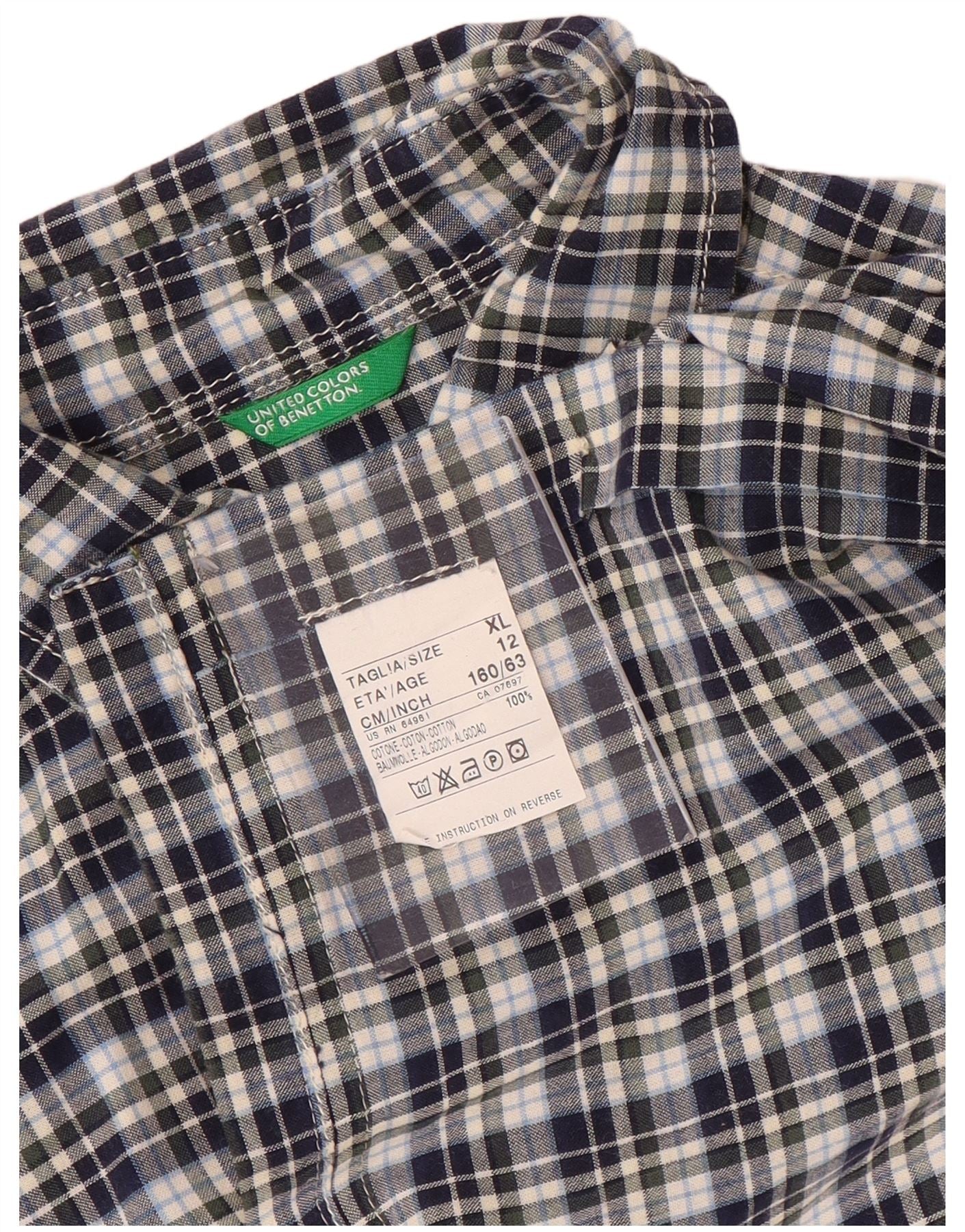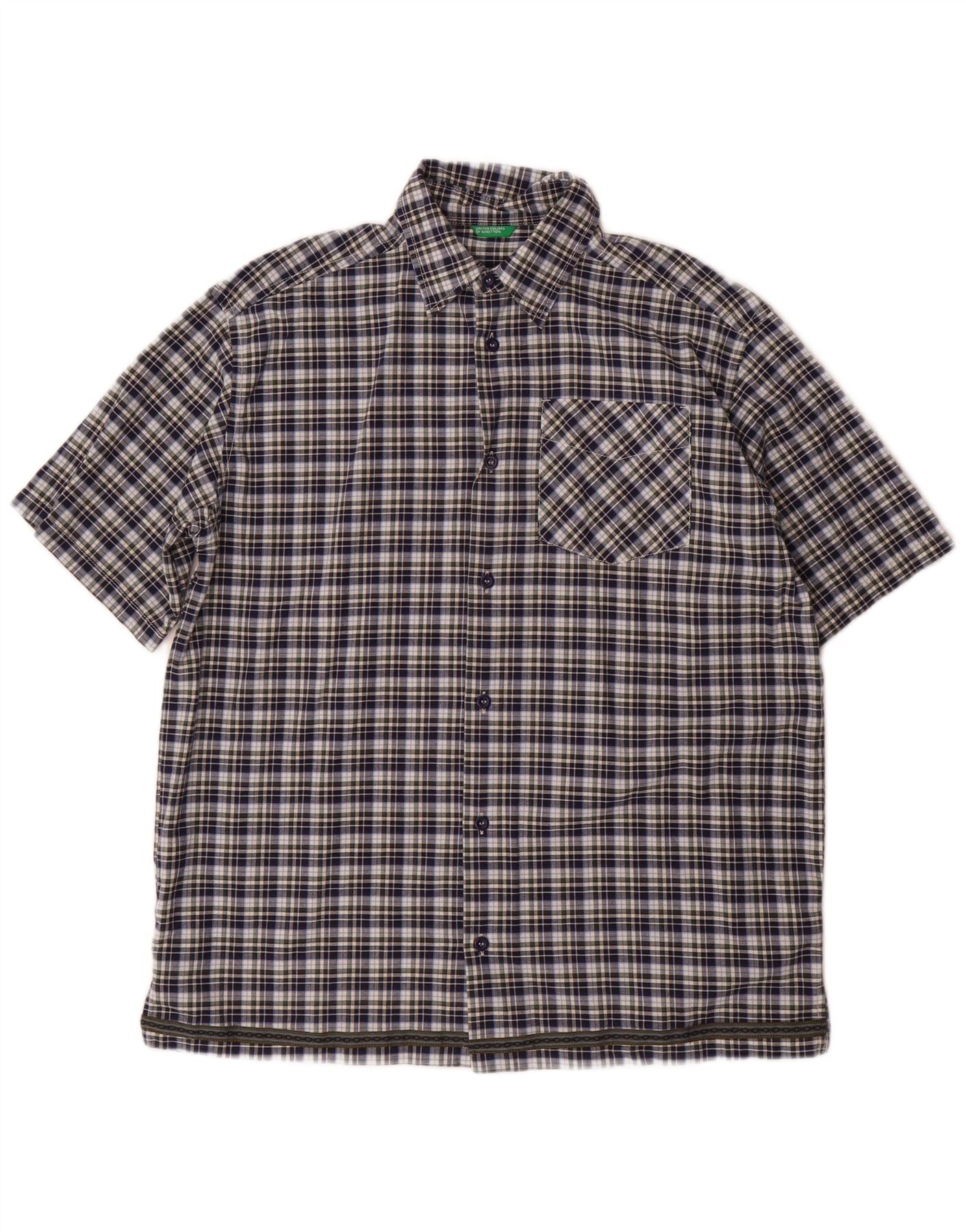 Camisa de manga curta masculina BENETTON 11-12 anos XL azul marinho xadrez algodão