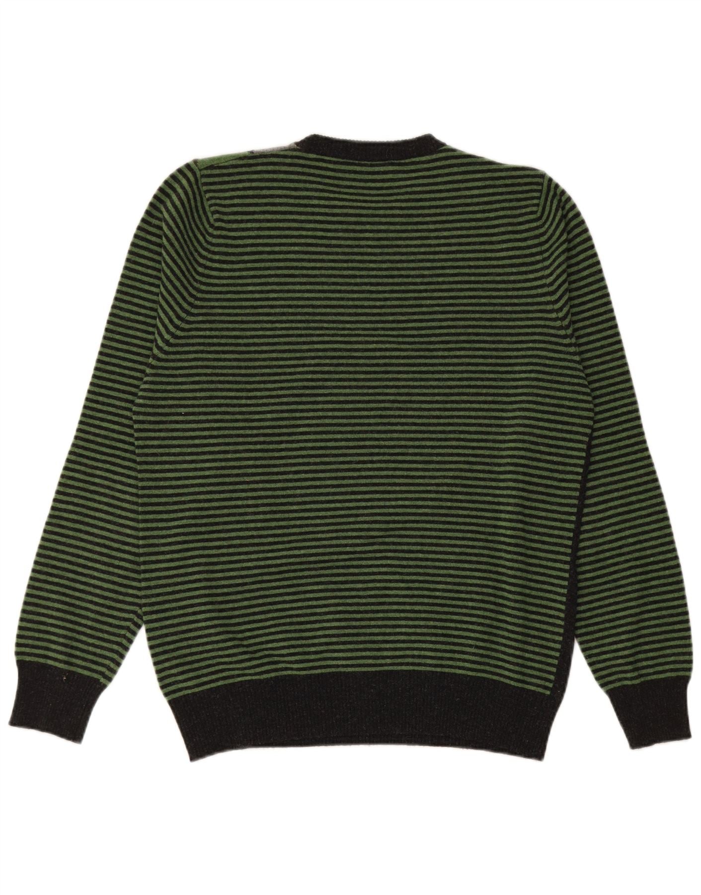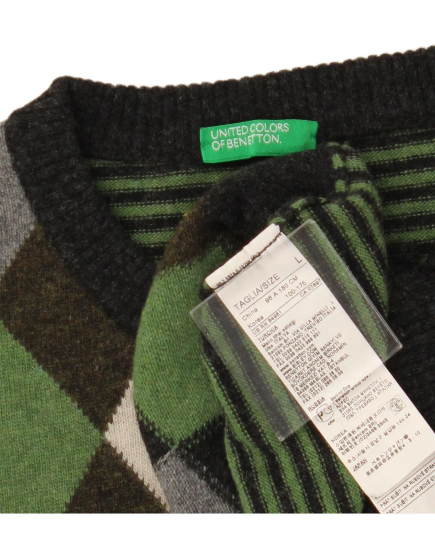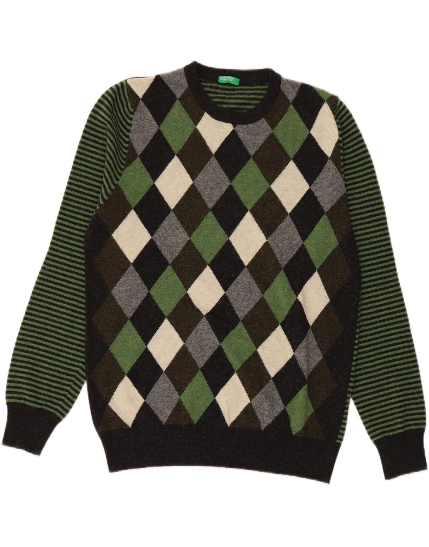 BENETTON Mens Crew Neck Jumper Sweater Large Green Argyle/Diamond Wool