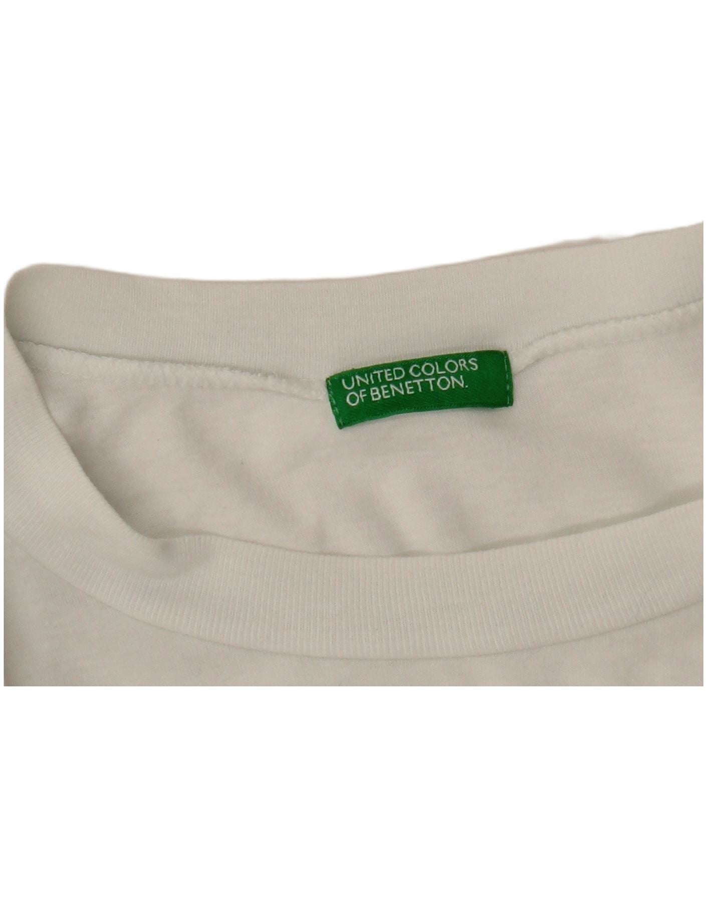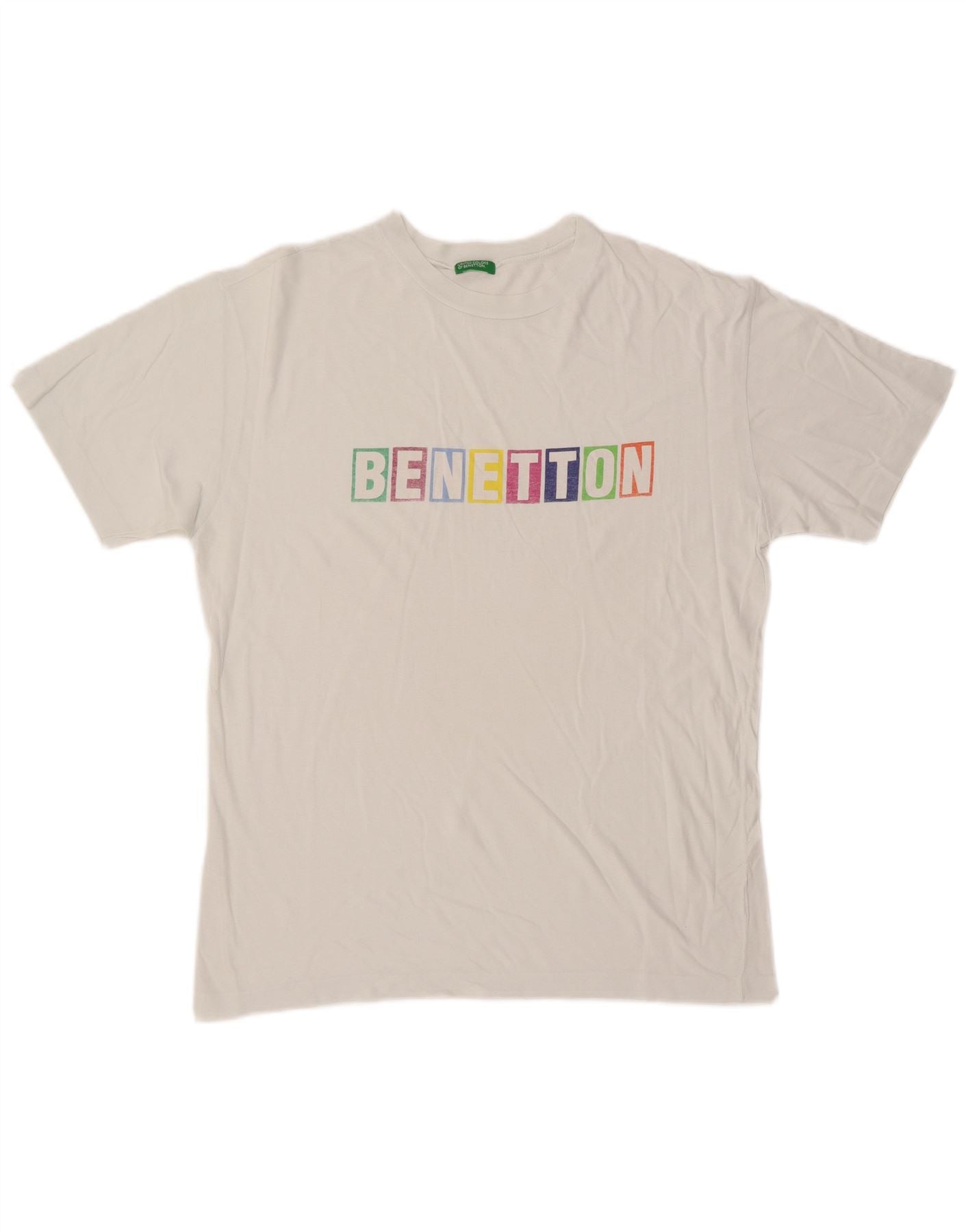 - Descrição da IA: Esta camiseta gráfica masculina da United Colors Of Benetton é confeccionada em tecido jersey branco macio. Possui gola redonda clássica e mangas curtas. O design do pulôver oferece um ajuste regular e confortável. Um logotipo BENETTON vibrante e colorido é exibido com destaque na frente, adicionando um toque distinto. Esta peça combina conforto com um estilo ousado e exclusivo.