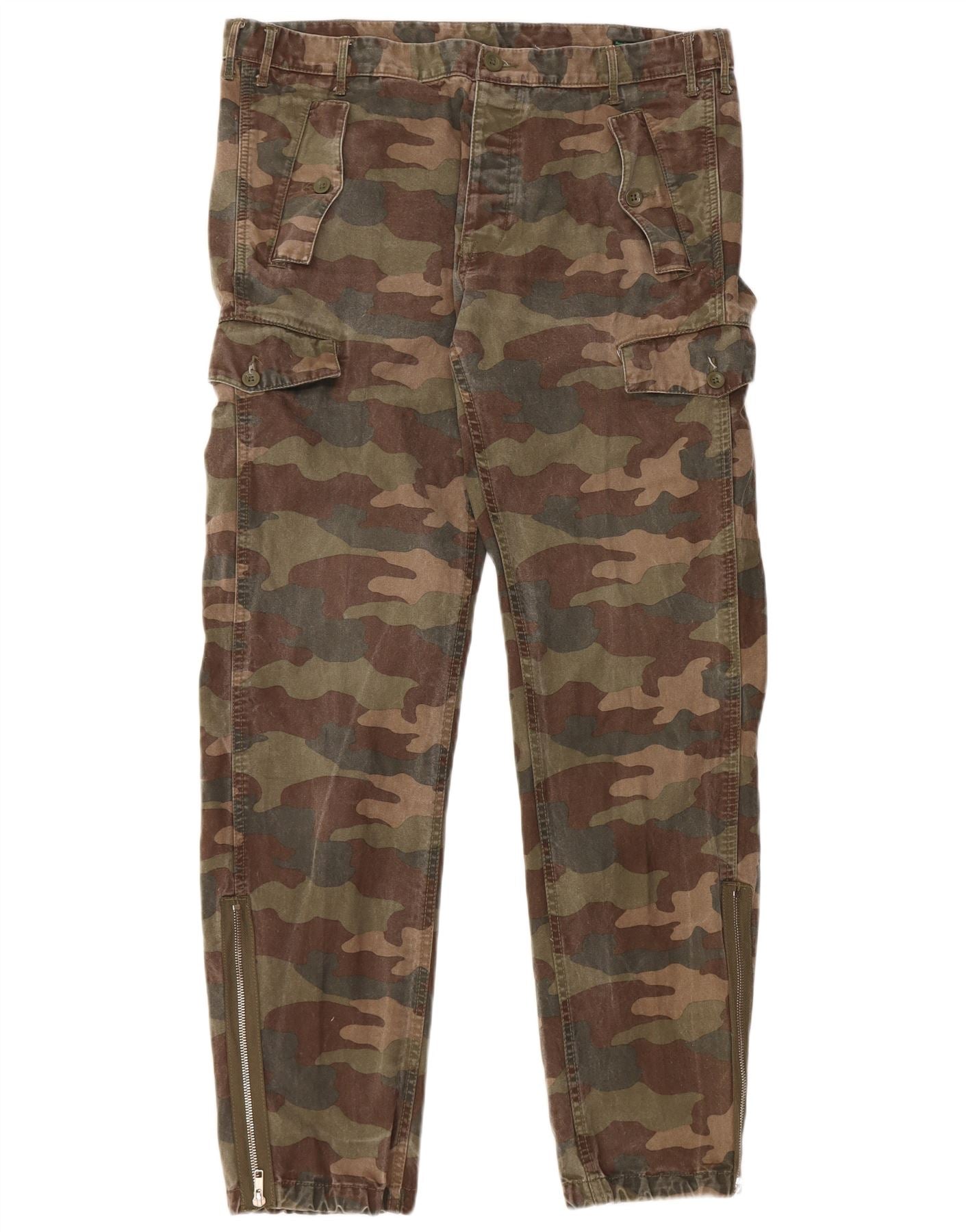 Calça cargo masculina BENETTON IT 50 grande W36 L32 camuflagem cáqui