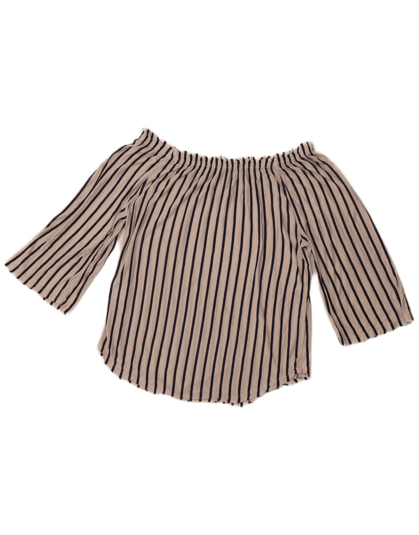 Top feminino BENETTON manga 3/4 sem ombro Reino Unido 14 listrado branco médio