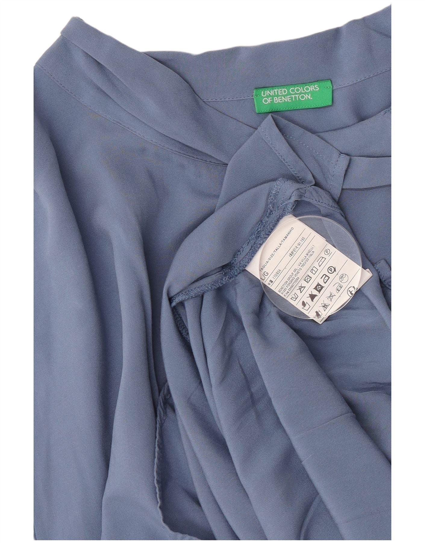 Home > Roupas Vintage Benetton > mulheres > Blusa feminina de manga comprida com gravata frontal Benetton Reino Unido 16 grande viscose azul