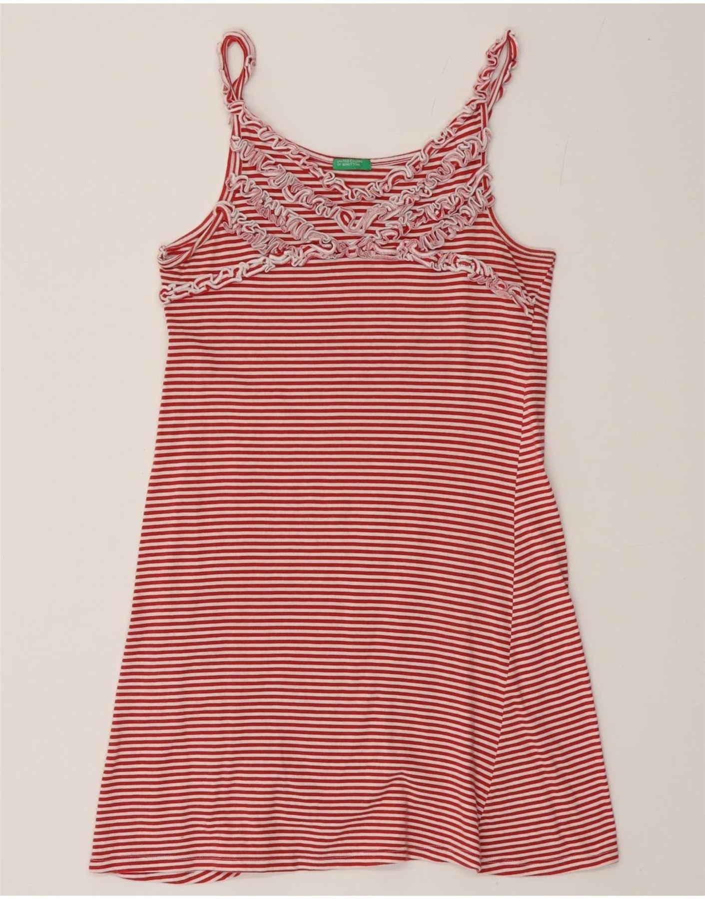 - Descrição da IA: Este vestido slip feminino da United Colors Of Benetton é confeccionado em tecido de malha leve, oferecendo conforto e toque macio. Possui um padrão listrado vibrante em vermelho e branco. O design sem mangas tem alças finas delicadas e um detalhe de decote com babados. Seu ajuste regular garante uma silhueta confortável e relaxada. Este estilo de pulôver é perfeito para usar na praia.