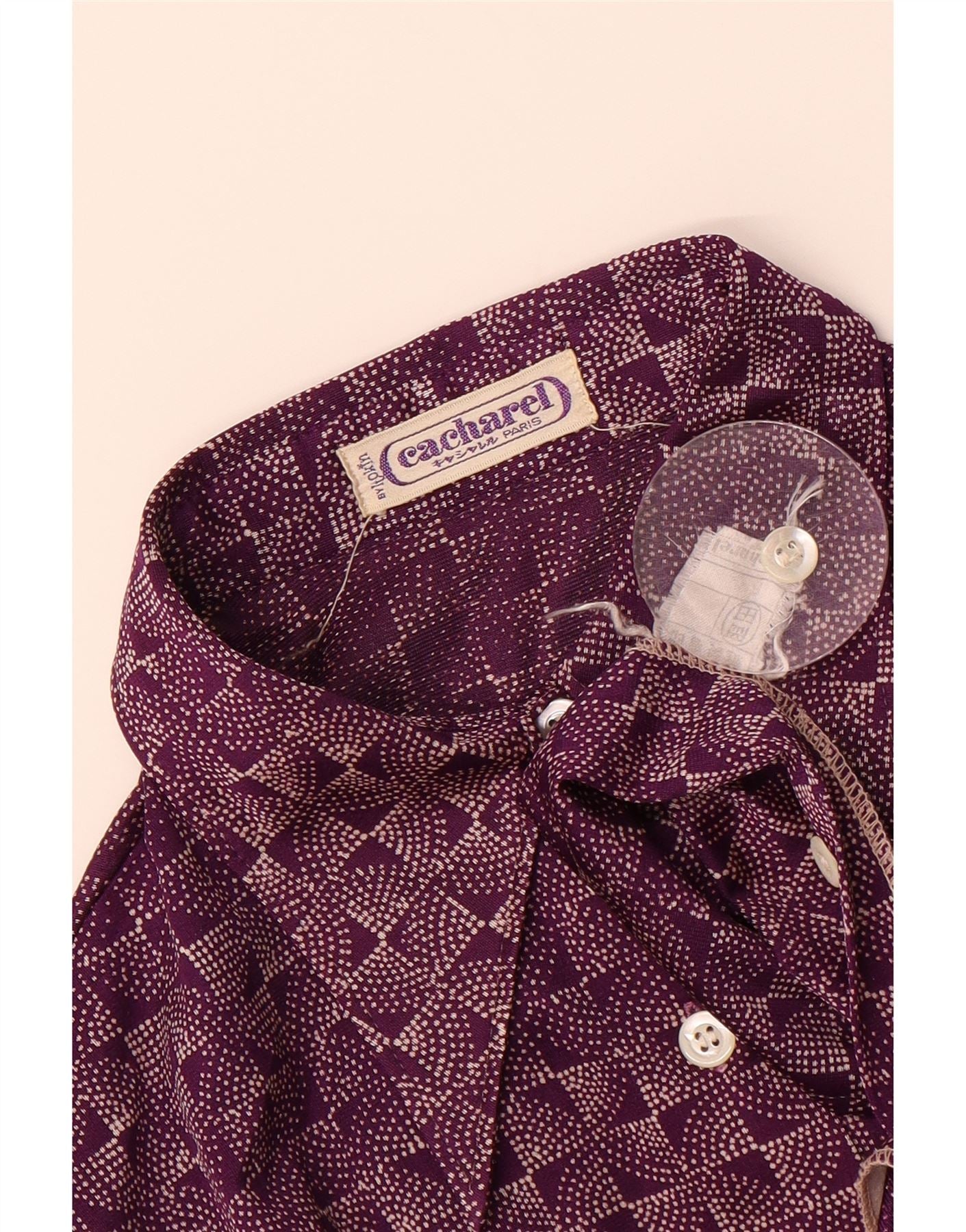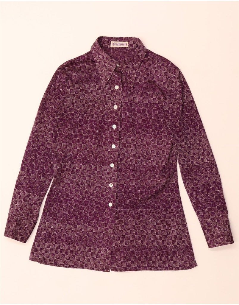 - Descrição da IA: Esta blusa feminina Cacharel é confeccionada em tecido sintético leve, oferecendo acabamento liso. Apresenta um padrão geométrico distinto em um rico tom roxo. O decote com gola e os botões frontais mantêm uma silhueta clássica. As mangas compridas terminam com punhos abotoados. Um ajuste regular garante um uso confortável e um apelo atemporal. Seu estilo retrô oferece um visual sofisticado e único.