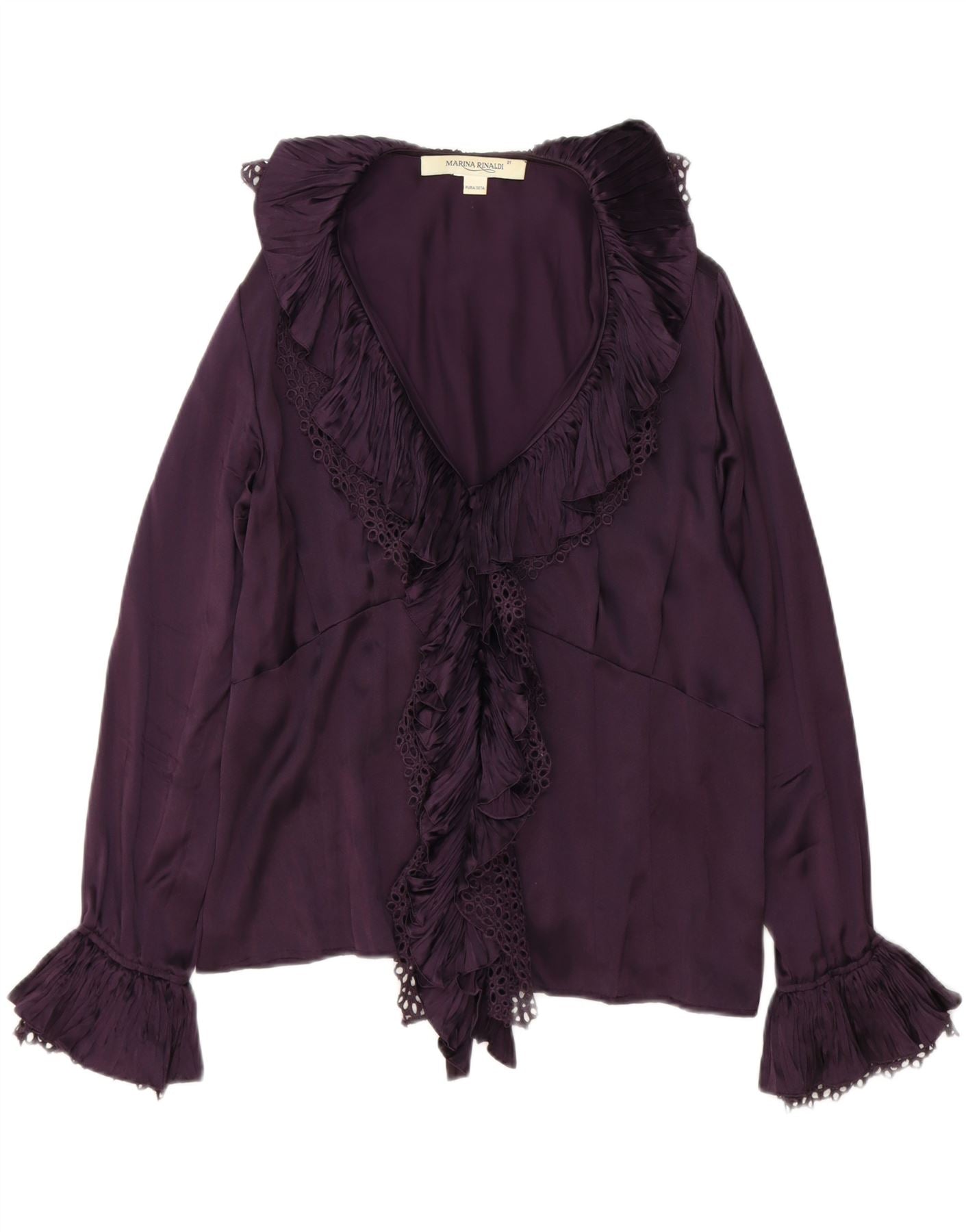 - Descrição da IA: Esta blusa feminina Marina Rinaldi é confeccionada em luxuoso cetim de seda pura. Seu rico tom bordô adiciona sofisticação. O decote em V leva a um elegante fecho frontal. Mangas compridas completam a silhueta regular fit. Acentos delicados de babados realçam o design. Esta peça oferece conforto e estilo refinado.