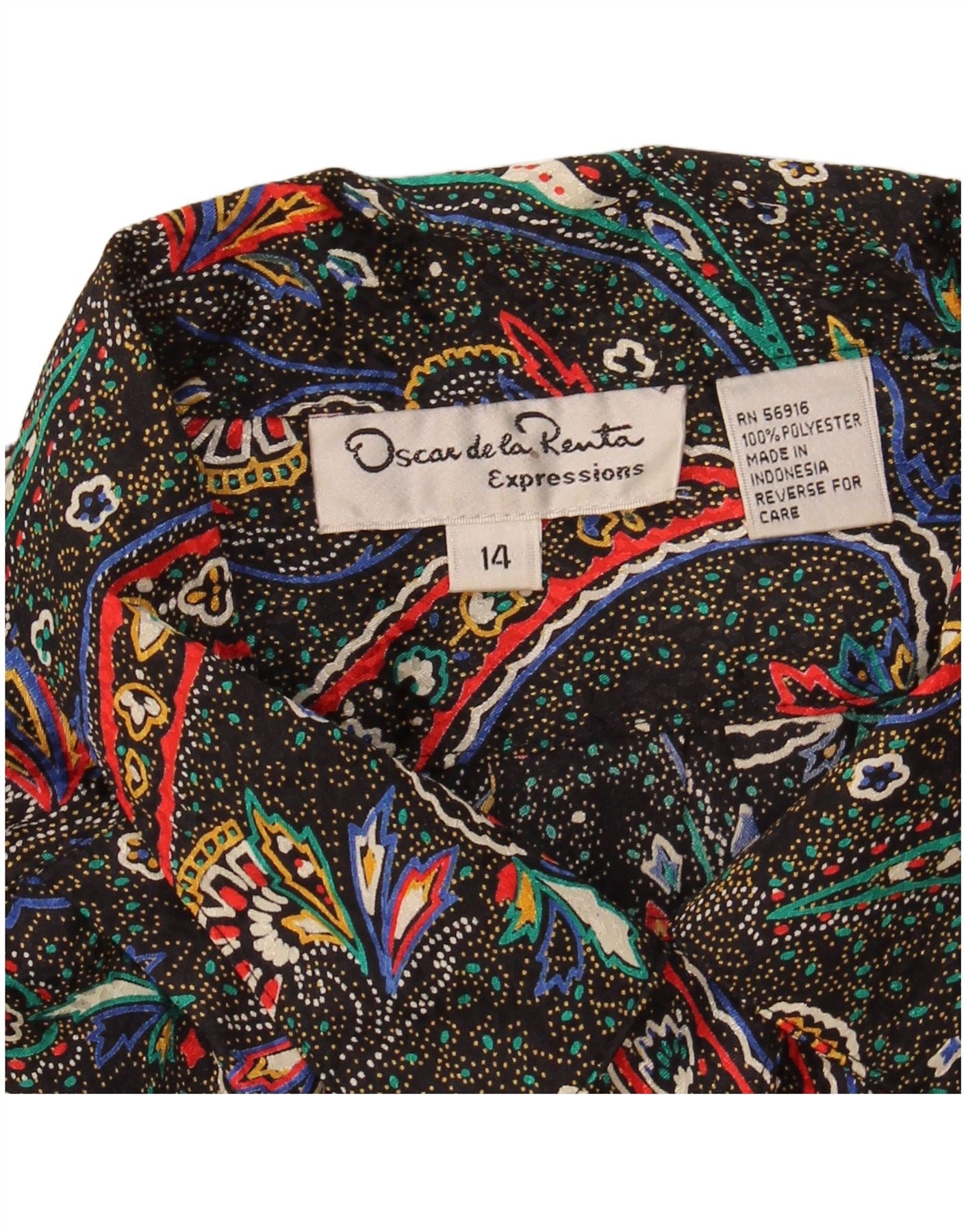 - Descrição da IA: Esta blusa feminina Oscar De La Renta é confeccionada em 100% poliéster com textura tecida. Ele apresenta um impressionante padrão paisley multicolorido e abstrato. O decote com gola e as mangas compridas oferecem uma silhueta refinada. O fechamento por botão garante um acabamento elegante. Esta blusa de corte regular combina estilo clássico com interesse visual vibrante.