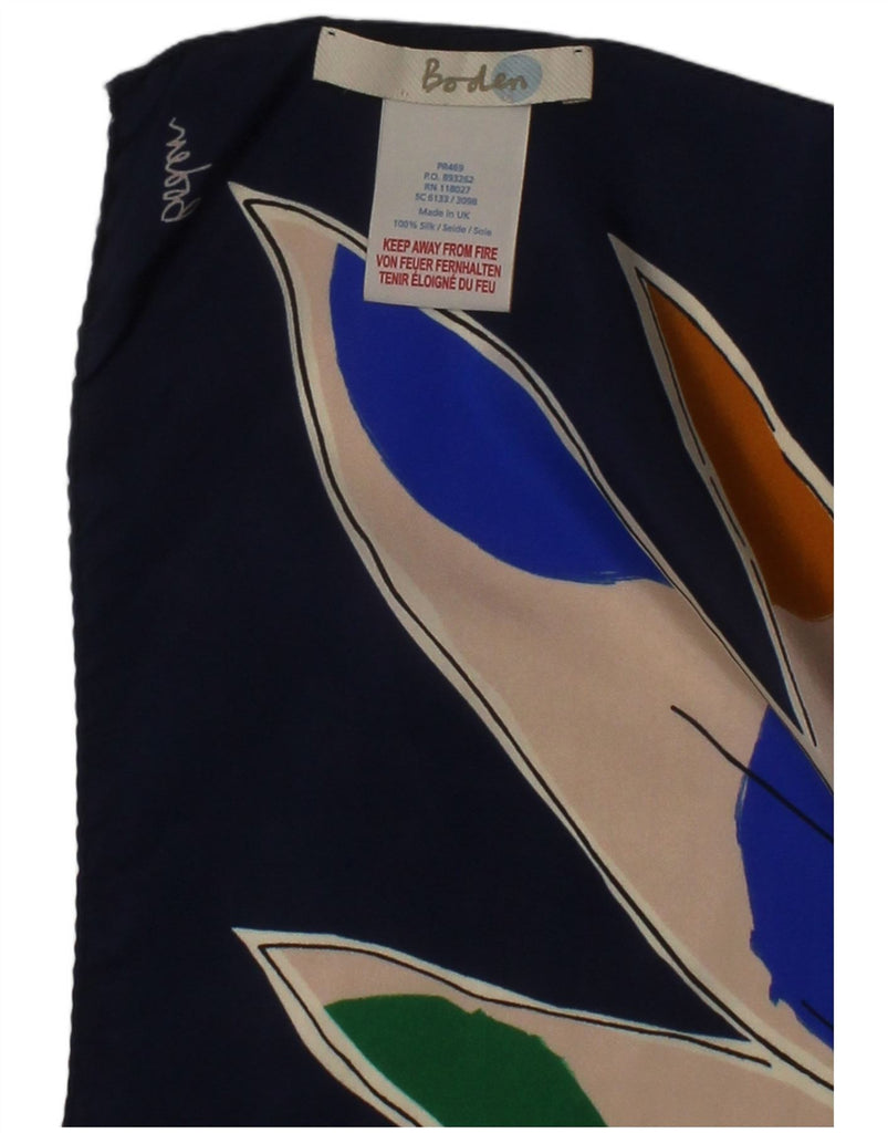 - AI Description: This Boden womens square scarf is crafted from luxurious 100 percent silk, offering a smooth, soft feel. It features a striking geometric pattern in navy blue, with multicoloured accents. The classic square shape allows for versatile styling. Its graphic design adds a sophisticated, artistic touch, perfect for elevating any ensemble. The high-quality silk drapes beautifully, ensuring an elegant finish.