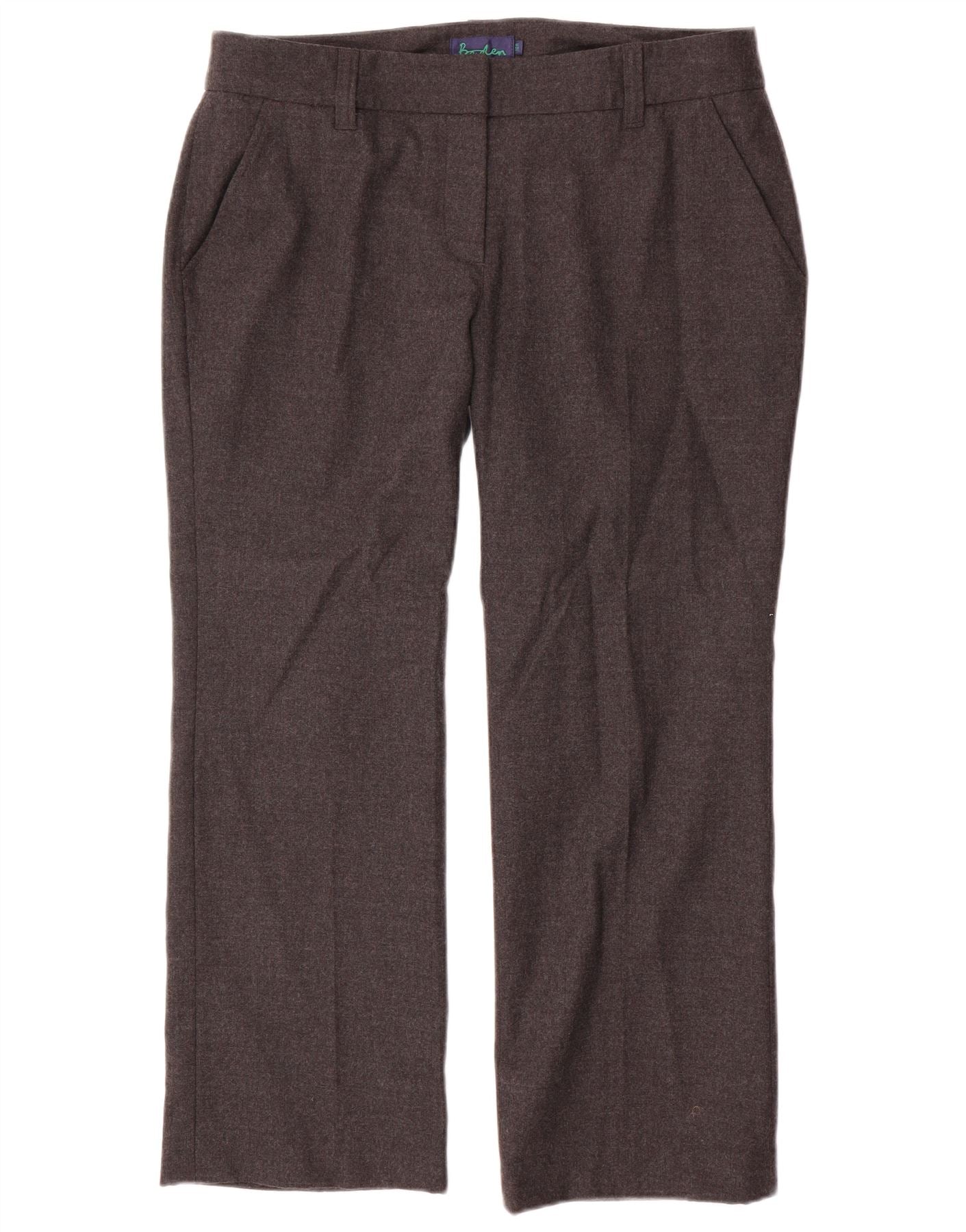 - AI Description: These Boden womens trousers are crafted from a luxurious grey wool blend, offering a smooth texture and comfortable stretch. They feature a classic mid-rise waist with a secure zip closure. The regular fit ensures a flattering silhouette, while practical pockets add functionality. Their plain design makes them a versatile addition to any wardrobe, perfect for a smart casual or professional look.