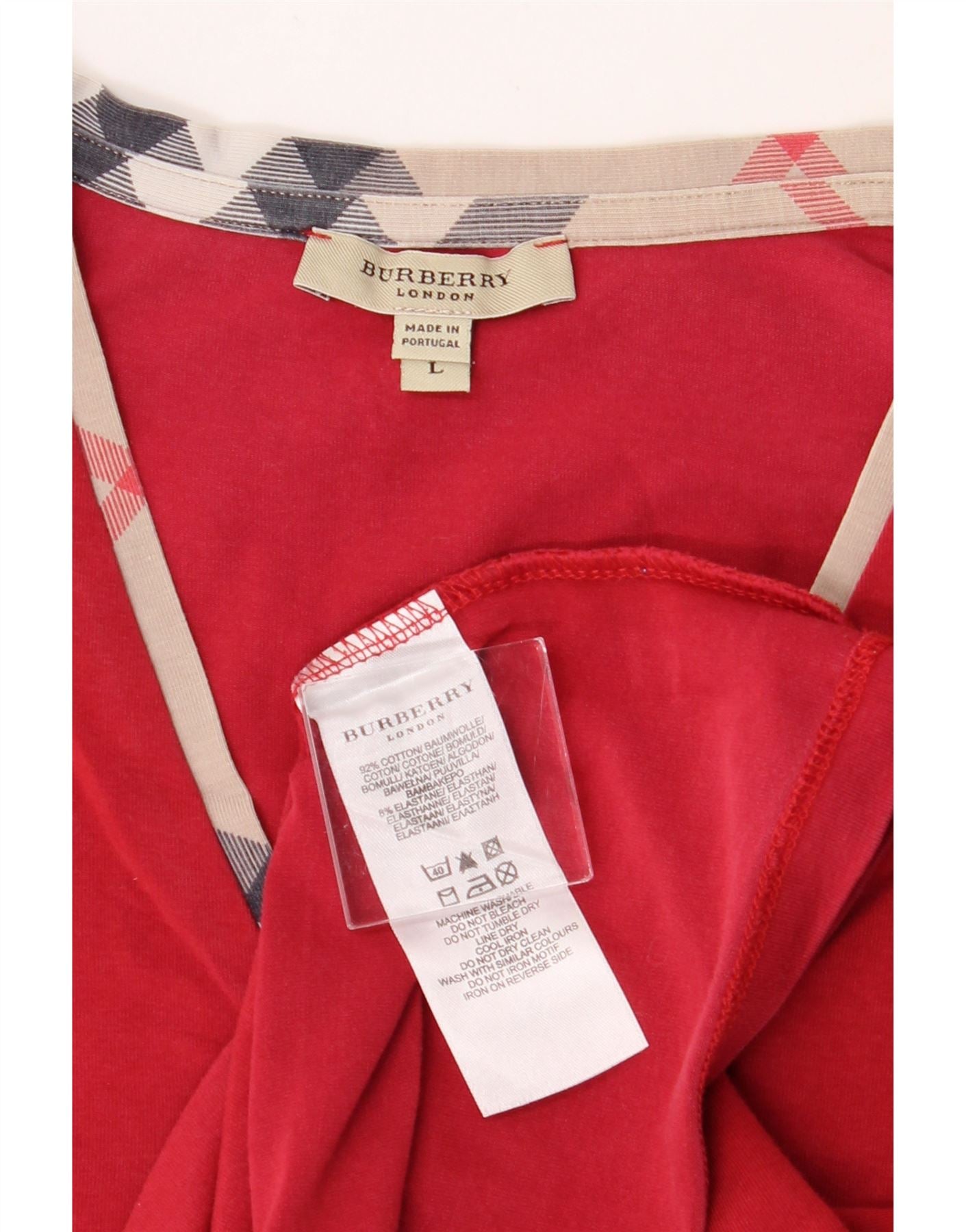 - Descrição da IA: Esta camiseta Burberry usada, confeccionada em Portugal com 95% algodão e 5% jersey de elastano, oferece um estilo clássico e um ajuste regular confortável. A camiseta vermelha com decote em V apresenta mangas curtas, fecho pulôver e um logotipo sutil. A roupa apresenta um leve desgaste visível em geral. Tamanho da etiqueta L. Instruções de lavagem: Lavar à máquina a 30 graus. Siga a etiqueta de cuidados.