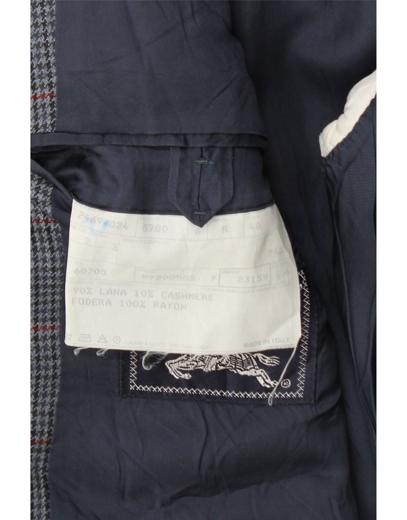 - Descrição da IA: Esta jaqueta blazer masculina da Burberrys é confeccionada em um luxuoso tecido azul marinho mesclado, com 90% de lã e 10% de caxemira. Ele apresenta um padrão xadrez refinado para um apelo clássico. O decote com gola e o fecho de dois botões definem a sua silhueta estruturada. Mangas compridas e corte clássico garantem elegância atemporal. É totalmente forrado e inclui bolsos práticos, oferecendo estilo e funcionalidade.