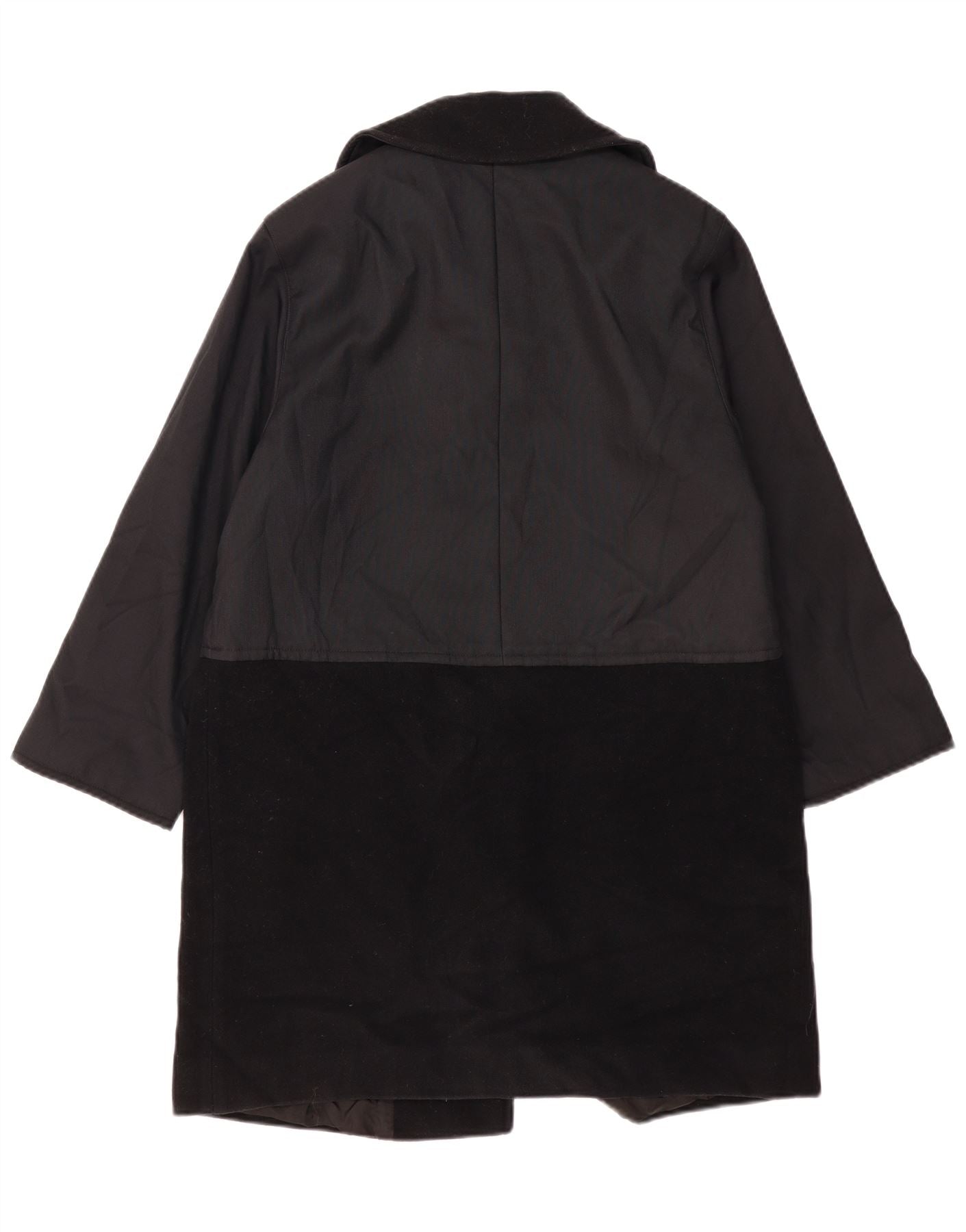- Descrição da IA: Este casaco Chesterfield feminino da Byblos é feito de um luxuoso tecido preto e veludo macio. Possui decote clássico com gola e mangas compridas. O casaco é desenhado com uma distinta divisão horizontal do painel, combinando texturas. O fecho frontal com três botões e os bolsos práticos acrescentam detalhes funcionais. O ajuste relaxado garante um uso confortável, enquanto o forro completo proporciona um acabamento suave.