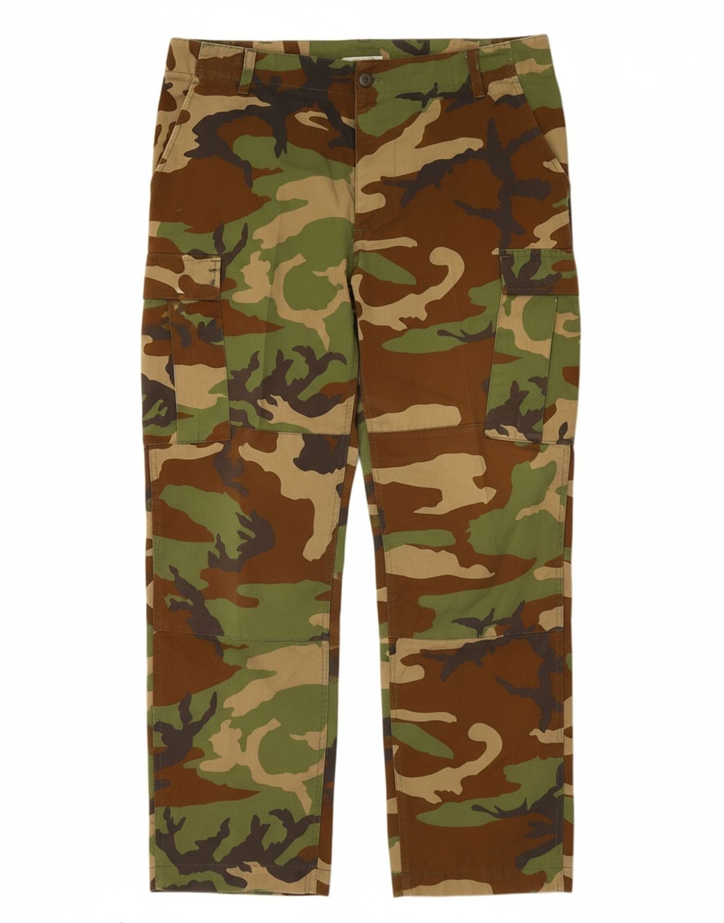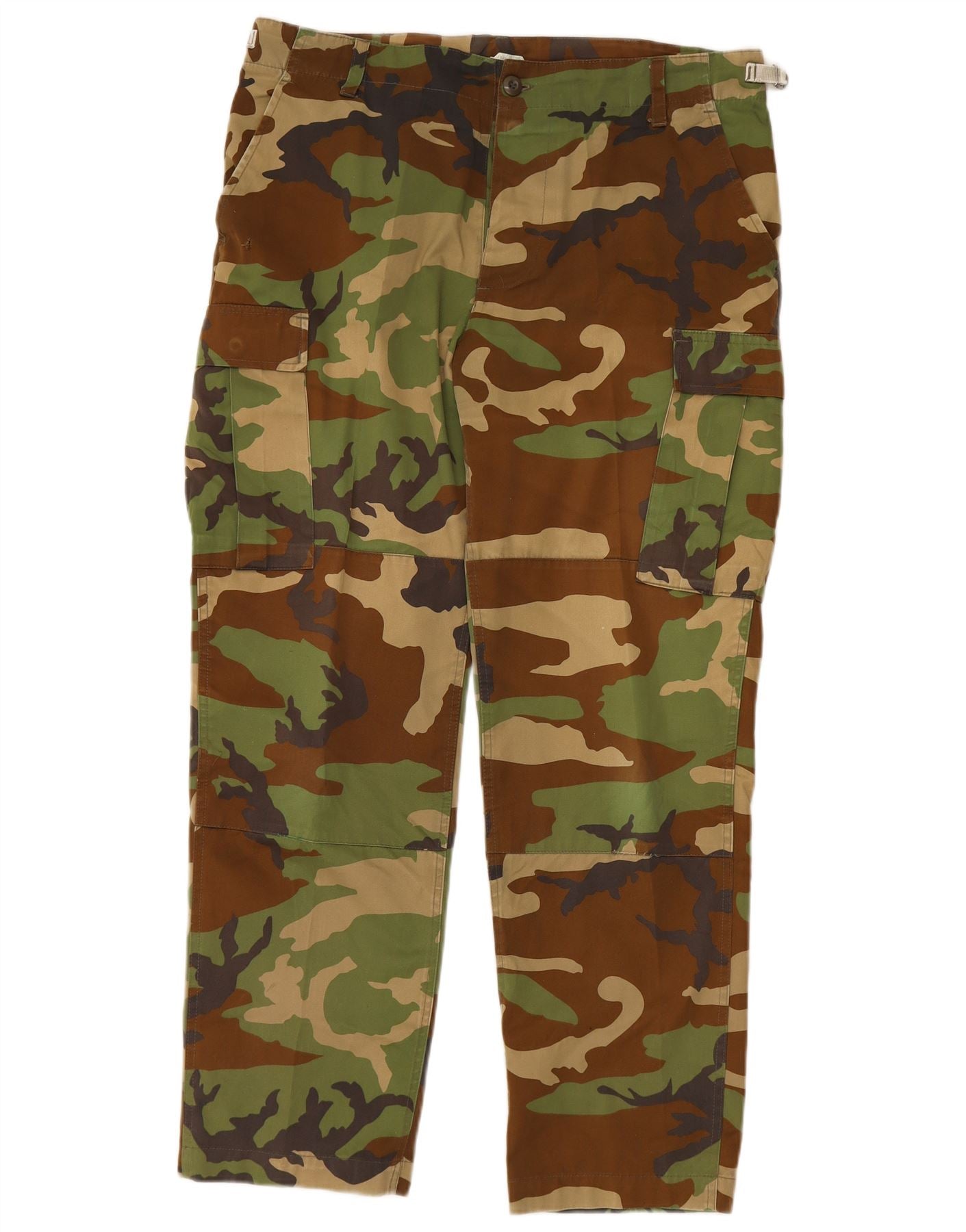 - Descrição da IA: Estas calças cargo masculinas vintage são feitas de tecido durável. Eles apresentam um padrão de camuflagem multicolorido distinto, misturando tons verdes, marrons e cáqui. O ajuste regular garante um uso confortável. Um fecho de botão protege a cintura. Bolsos práticos oferecem amplo armazenamento. Uma cintura ajustável proporciona um ajuste personalizável. Este estilo militar oferece utilidade robusta e uma estética clássica.