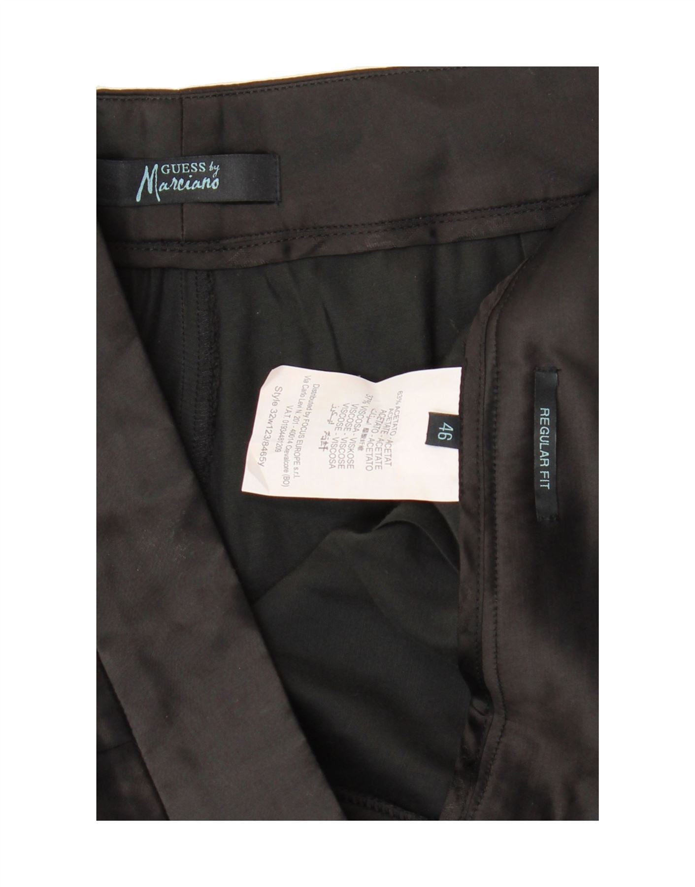 - Descrição da IA: Eleve o seu guarda-roupa com estas calças Guess By Marciano. Confeccionadas com uma mistura de 62% acetato e 38% rayon viscose, essas calças pretas oferecem conforto e estilo. O ajuste regular e o fecho pull-on garantem uma silhueta lisonjeira e facilidade de uso. Perfeitas para qualquer ocasião, estas calças usadas estão em excelentes condições e possuem bolsos práticos. Tamanho da etiqueta 46.