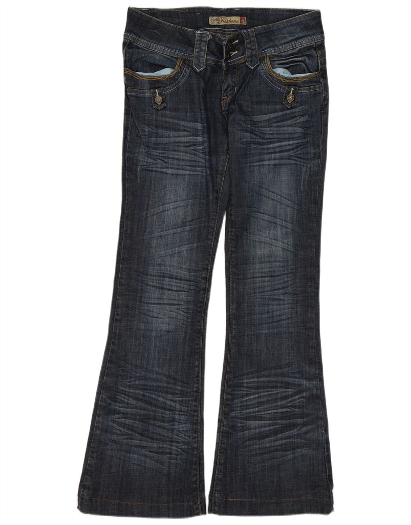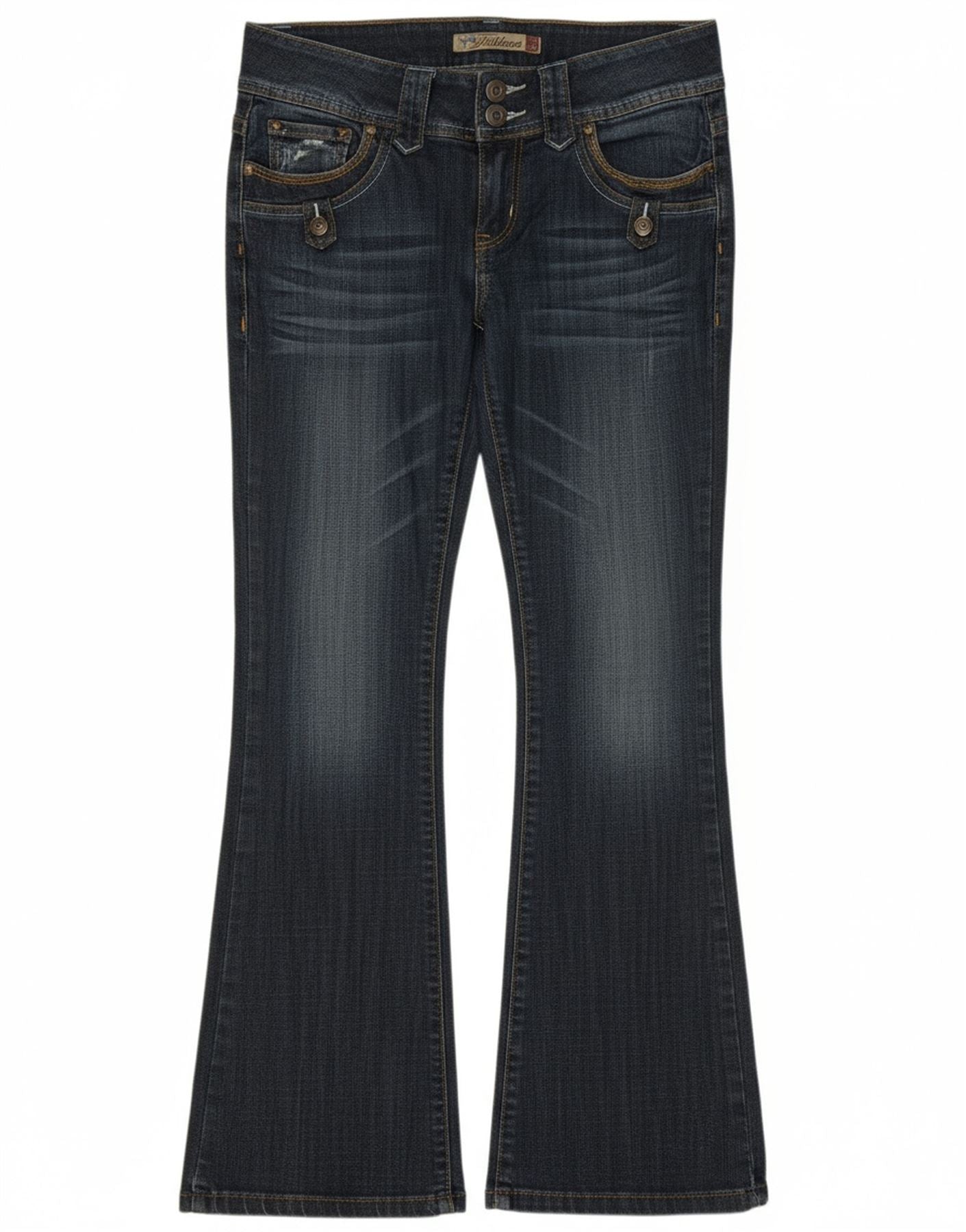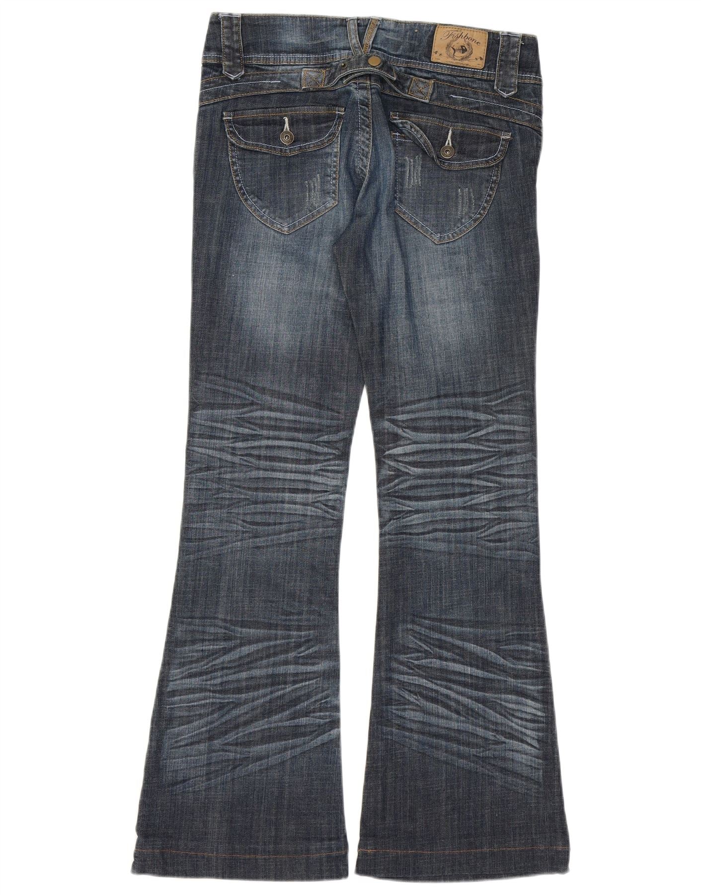 - Descrição da IA: Estes jeans bootcut femininos Fishbone são confeccionados em jeans de algodão azul com um toque de elastano para maior conforto. Eles apresentam cintura baixa e fecho de botão clássico. O ajuste regular na perna se alarga suavemente a partir do joelho. Detalhes sutis e desgastados adicionam um toque contemporâneo. Bolsos funcionais completam o design, oferecendo um estilo clássico e moderno.