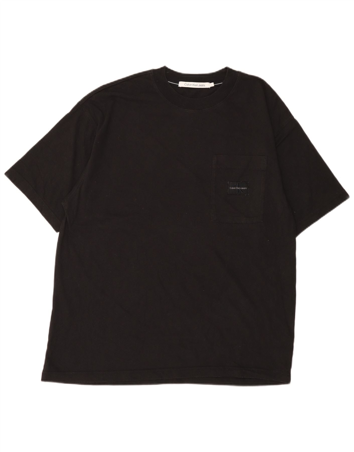 - Descrição da IA: Esta camiseta masculina Calvin Klein Jeans é confeccionada em jersey de algodão preto macio. Possui gola redonda clássica e mangas curtas. O ajuste regular garante um uso confortável. Um bolso sutil no peito com um logotipo tonal acrescenta um toque exclusivo. Este design de pulôver oferece estilo fácil para uso diário.