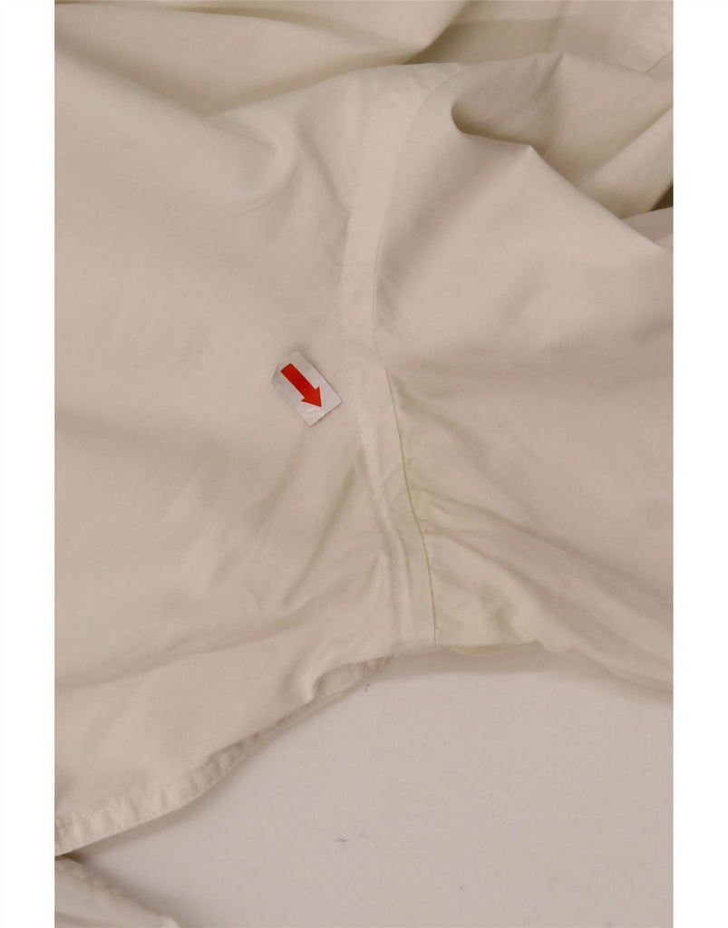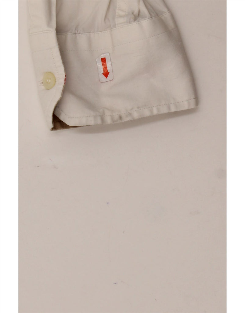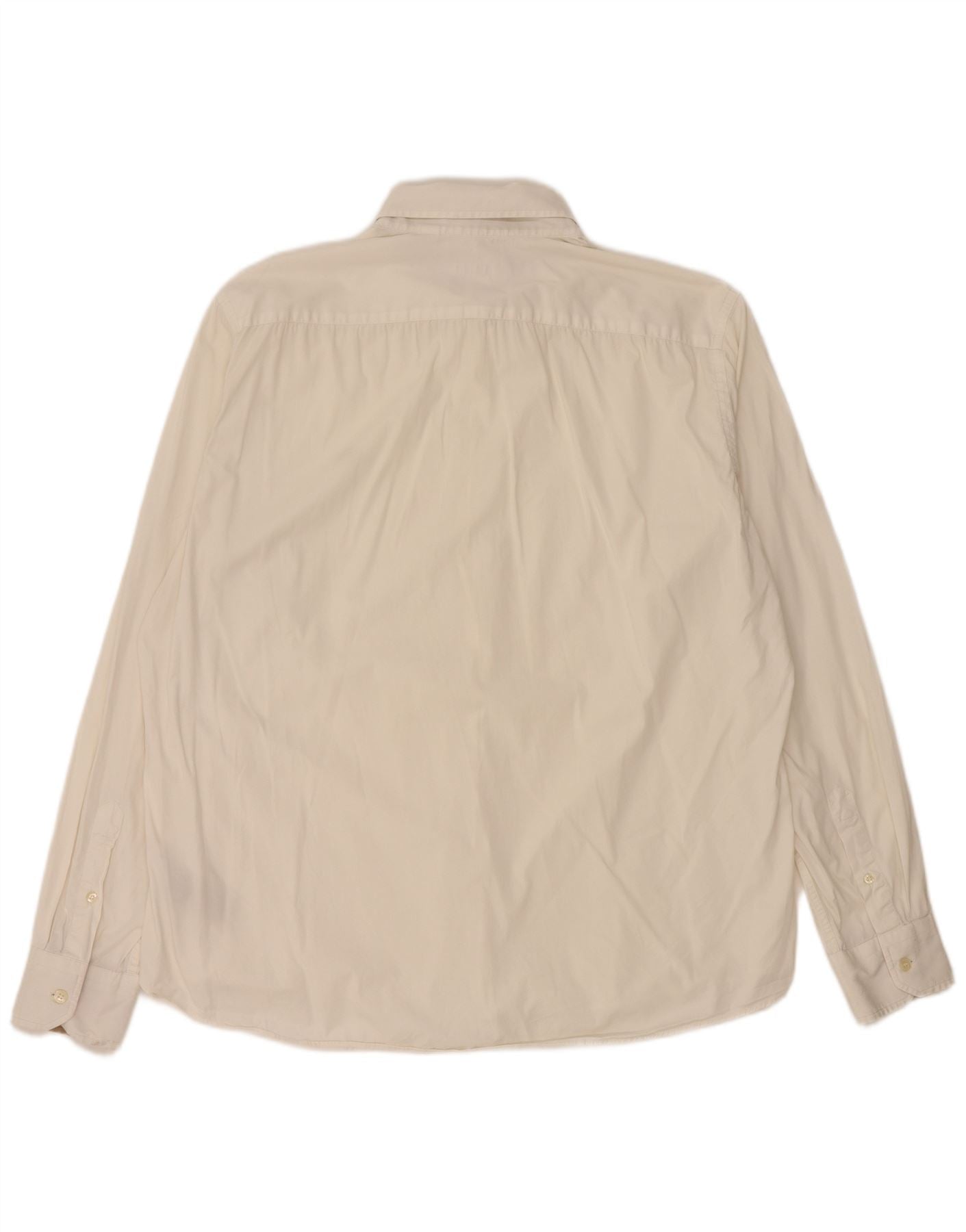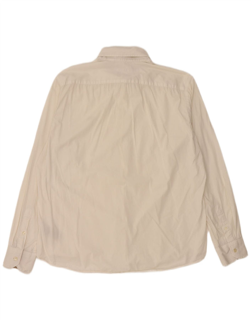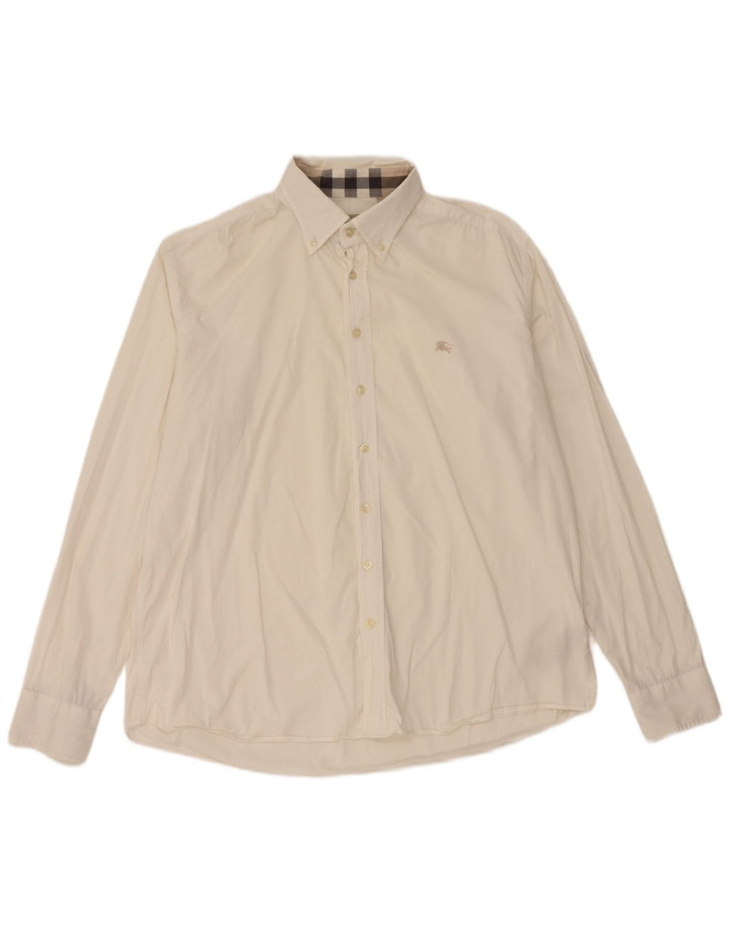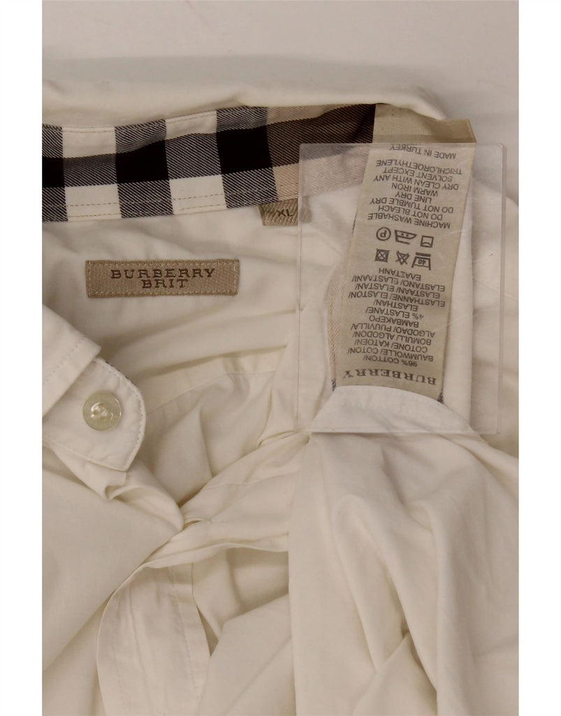 - Descrição da IA: Esta camisa masculina Burberry Brit é confeccionada em uma mistura de algodão branco. Possui decote clássico com gola e mangas compridas com detalhes em punhos. O botão na frente garante um fechamento elegante. Com corte regular e elasticidade adicional, esta camisa oferece conforto e uma silhueta inteligente. Um logotipo sutil completa o design atemporal.