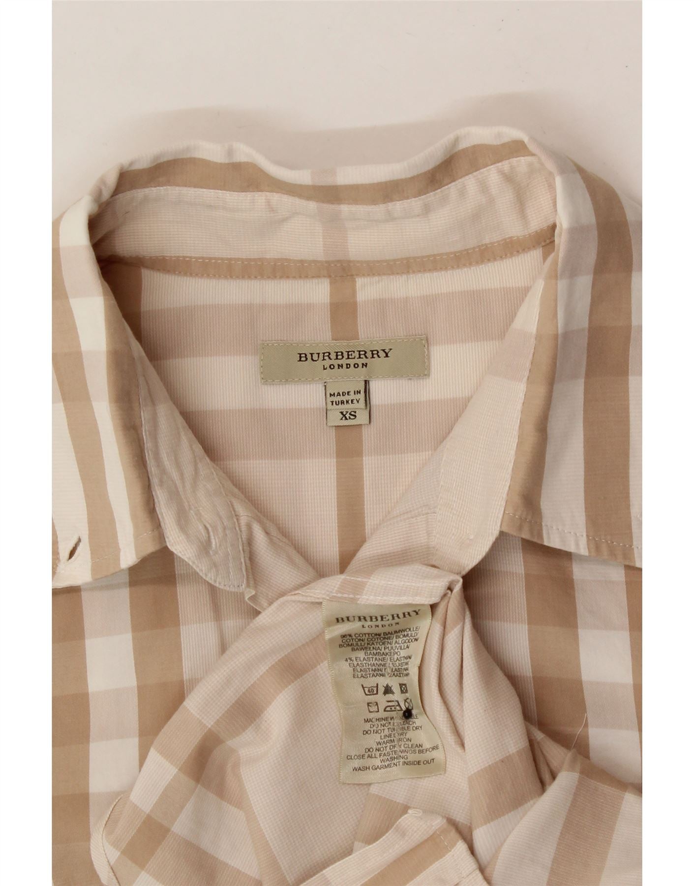 - Descrição da IA: Esta blusa camisa Burberry usada é uma adição clássica a qualquer guarda-roupa. Confeccionada na Turquia a partir de uma mistura confortável de 96% algodão rami e 4% elastano, esta blusa bege de manga curta apresenta padrão xadrez, decote com gola e fecho de botão. O design de ajuste regular inclui bolsos práticos. Embora esteja em excelente estado, há pequenos pontos soltos nos botões e na gola. Tamanho da etiqueta XS. Lavável na máquina para facilitar o cuidado.