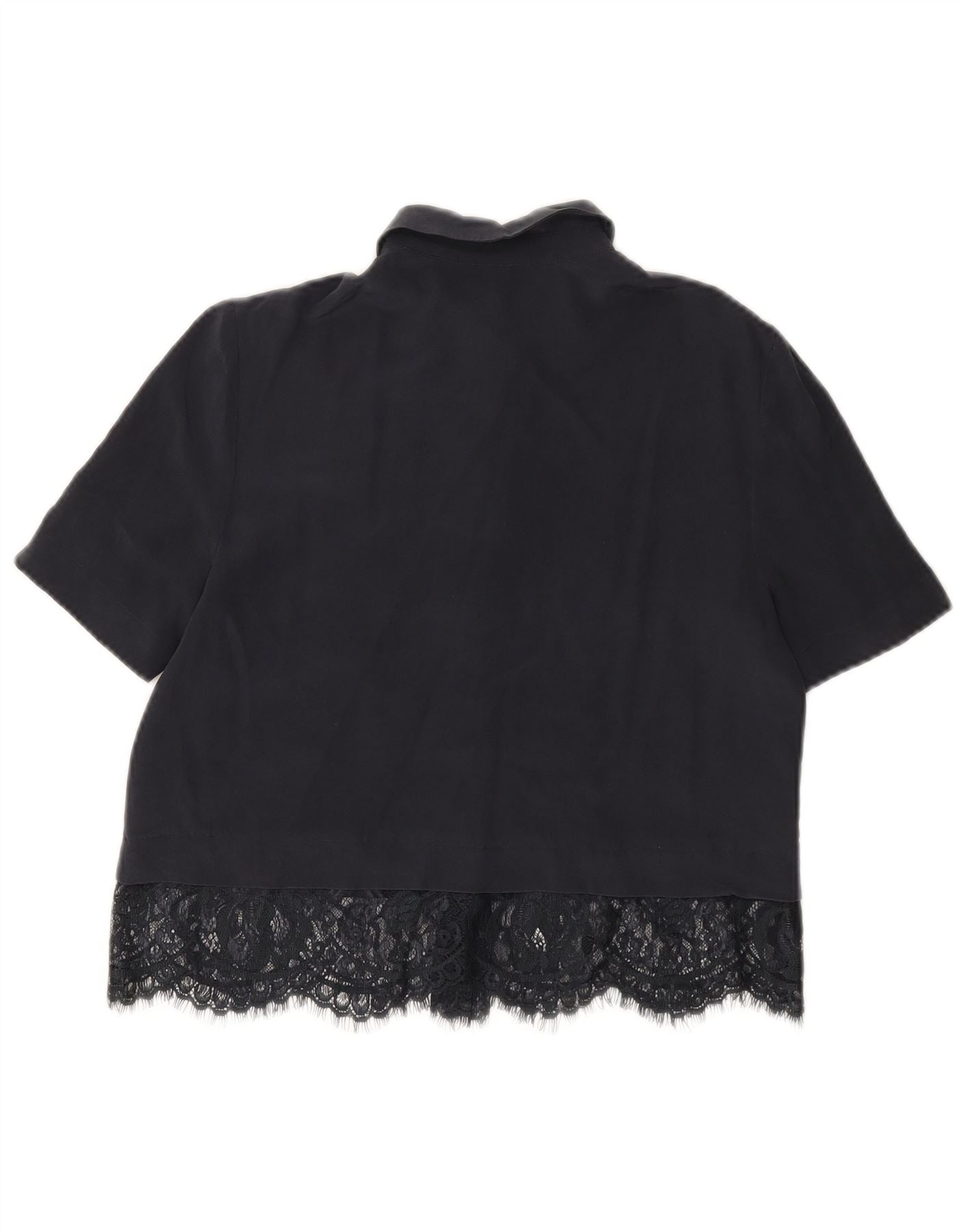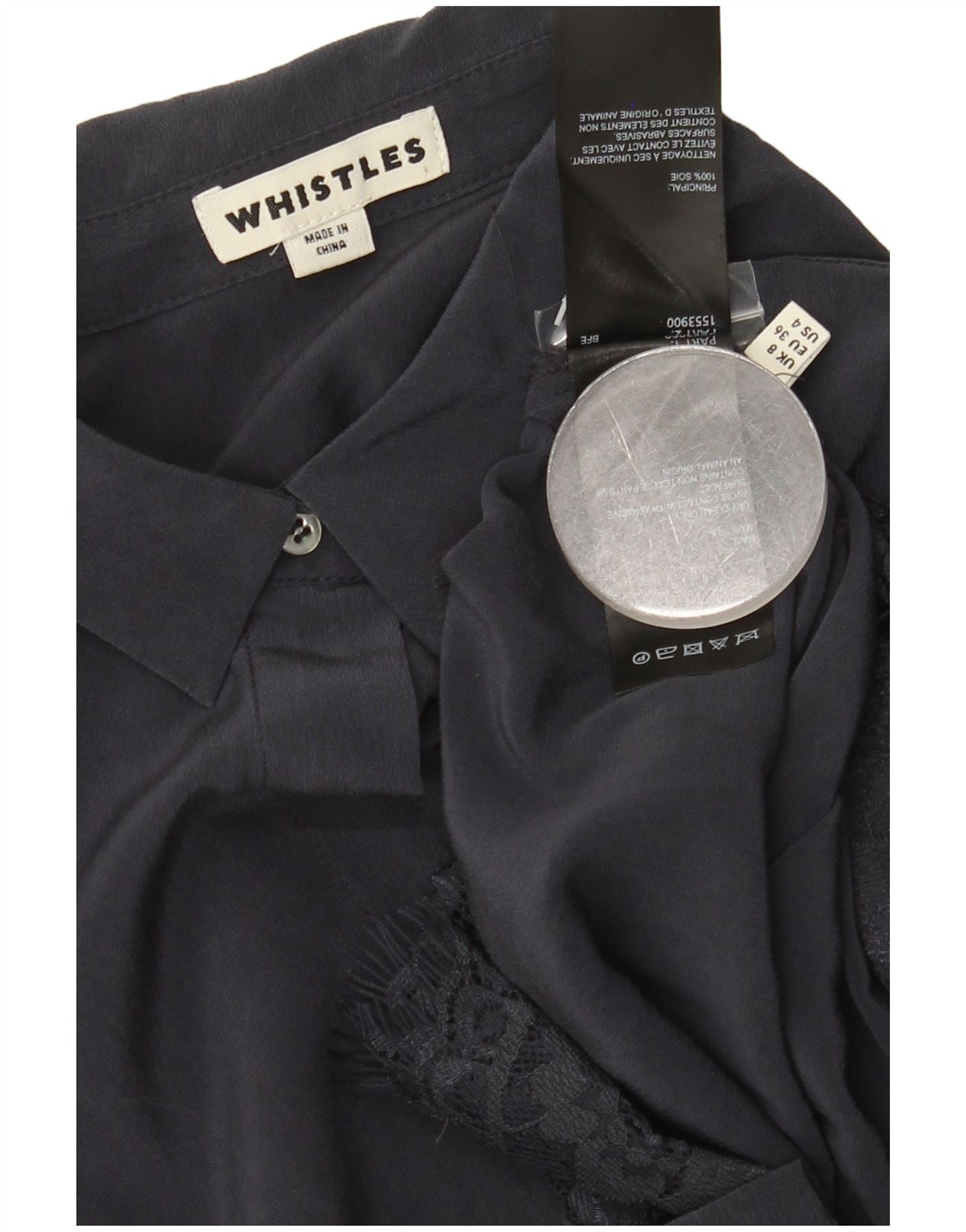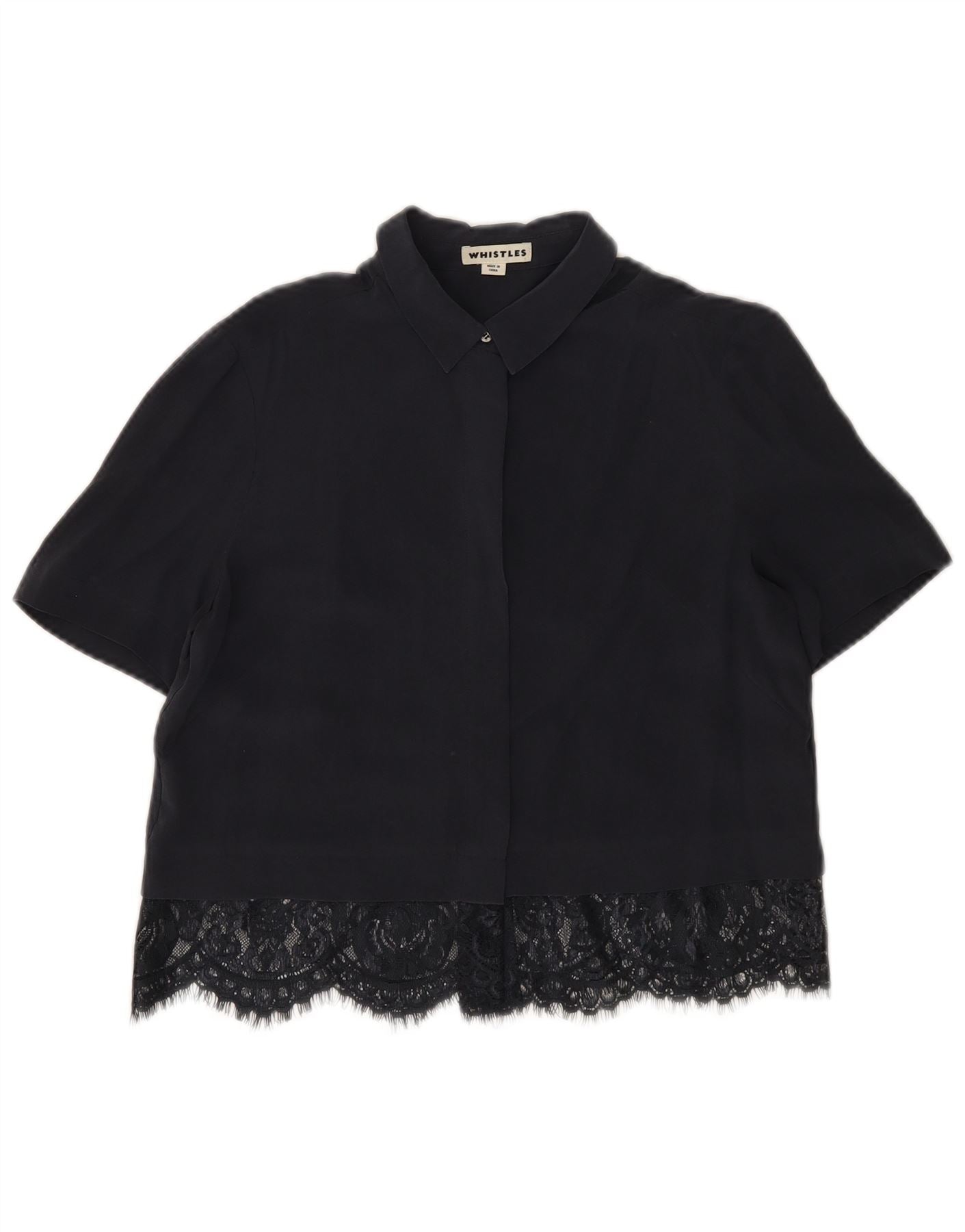 - Descrição da IA: Esta blusa feminina Whistles é confeccionada em 100% seda luxuosa, oferecendo uma textura tecida suave. Apresentado em sofisticado azul marinho, apresenta decote clássico com gola e manga curta. A frente com botões garante um acabamento elegante. Detalhes delicados de renda adicionam um toque refinado. Seu ajuste descontraído proporciona elegância confortável para um guarda-roupa versátil.