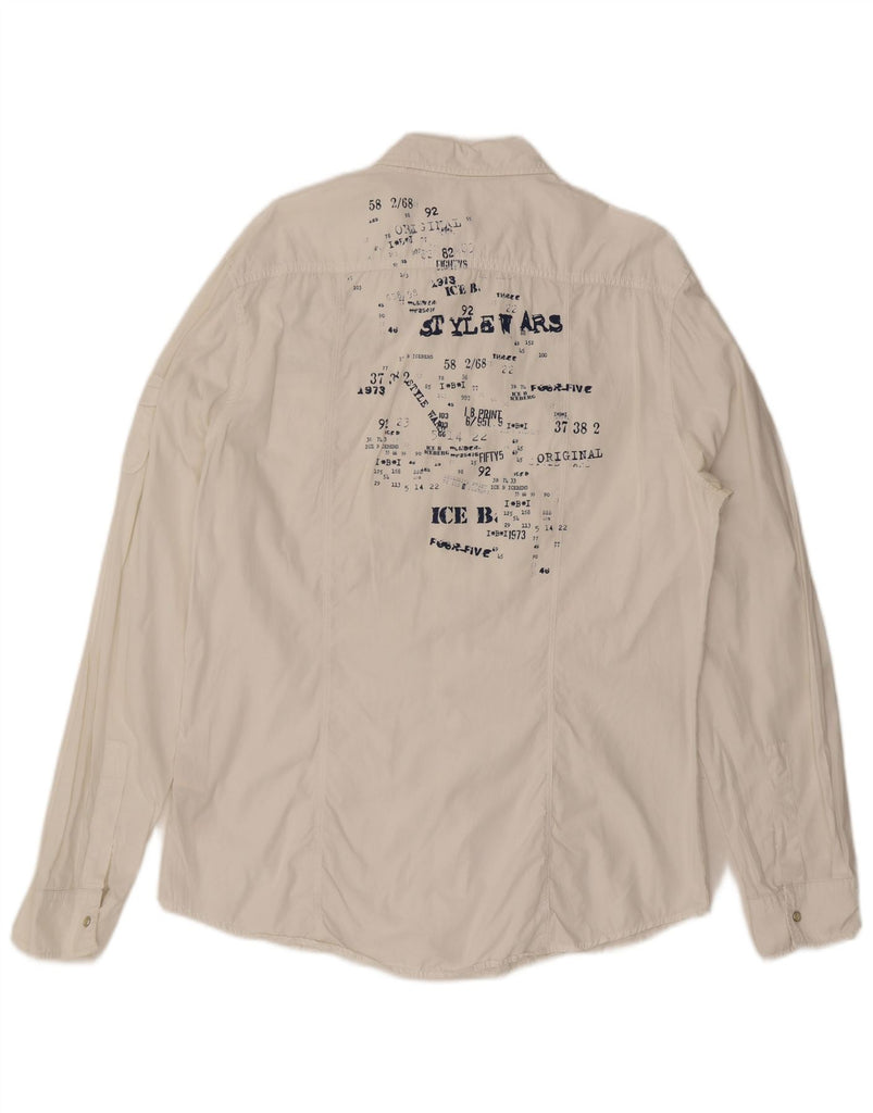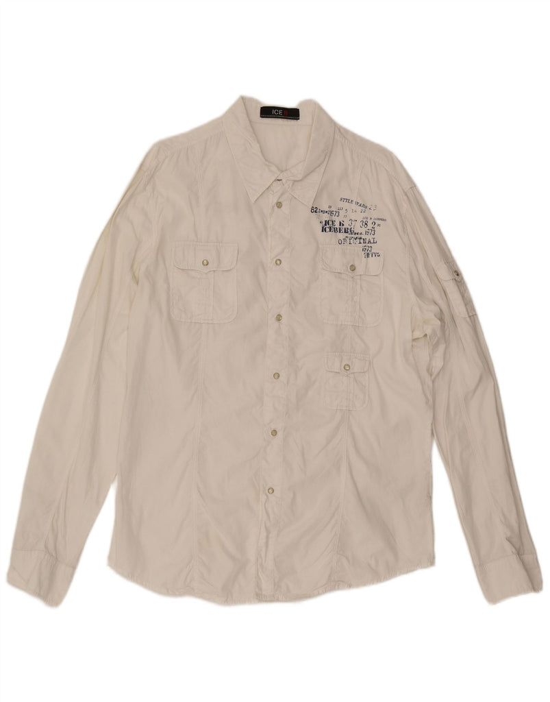 - Descrição da IA: Esta camisa masculina Ice B é confeccionada em tecido 100 algodão, oferecendo uma sensação suave, mas estruturada, em um versátil tom off white. Possui decote clássico com gola e mangas compridas. O ajuste regular garante um uso confortável. A frente com botões e bolsos práticos acrescentam detalhes funcionais. Um detalhe gráfico bordado proporciona um toque retrô.