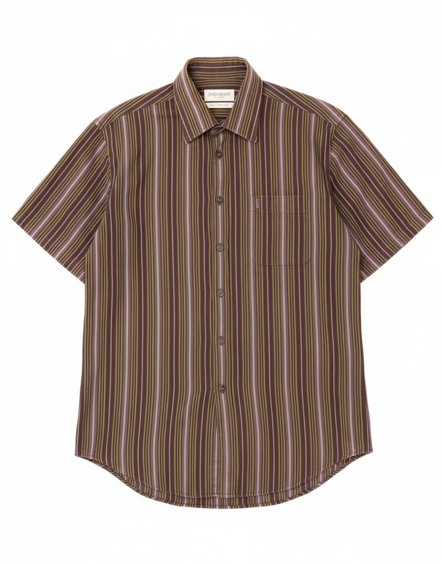 - Descrição da IA: Esta camisa masculina Yves Saint Laurent é confeccionada em 100% algodão, garantindo uma sensação nítida e confortável. Apresenta um impressionante padrão listrado multicolorido e geométrico em todo o tecido. O decote com gola e o fecho completo de botões oferecem uma silhueta clássica e refinada. Mangas curtas e corte regular proporcionam um uso confortável. Bolsos práticos completam este design sofisticado, combinando estilo com funcionalidade.