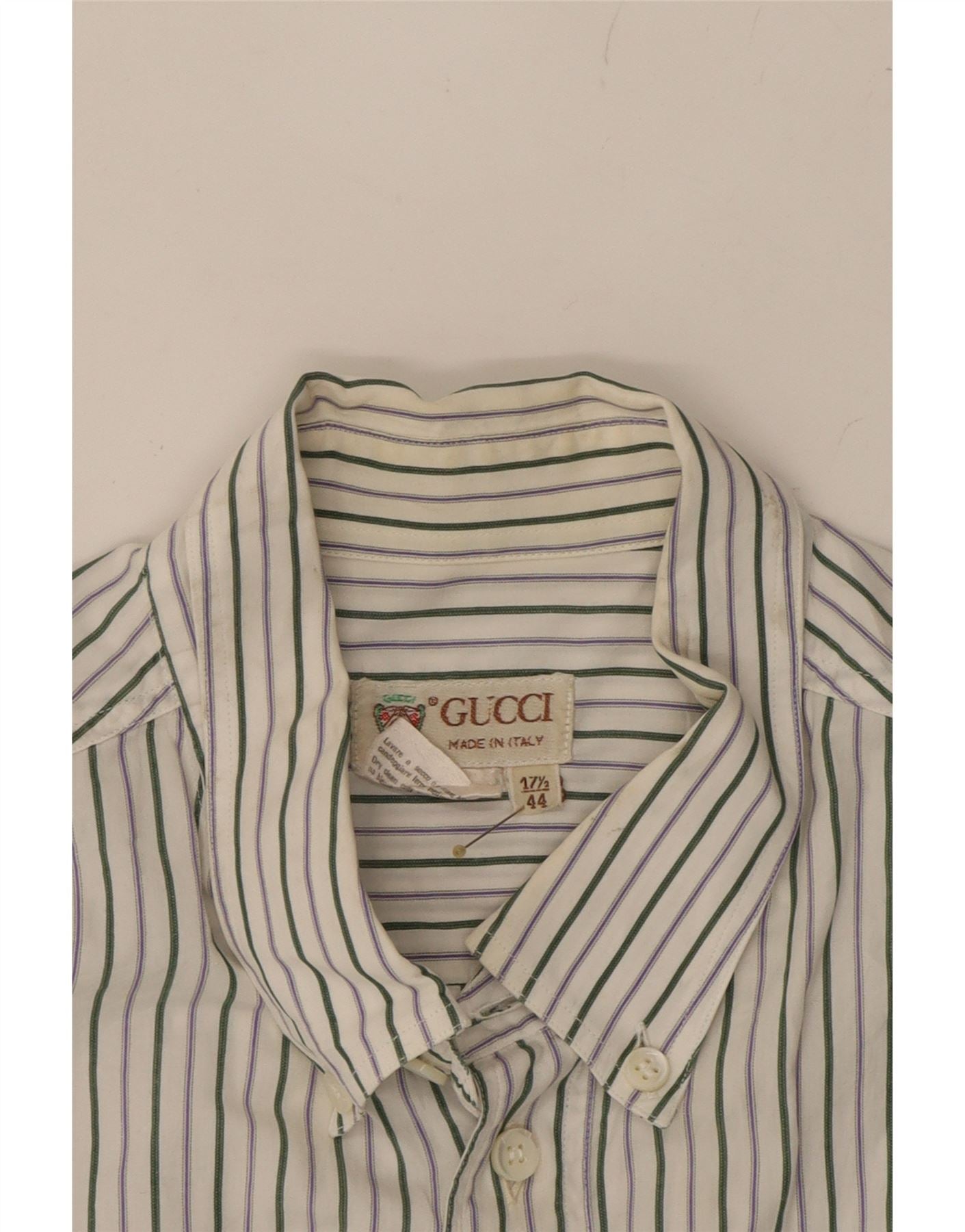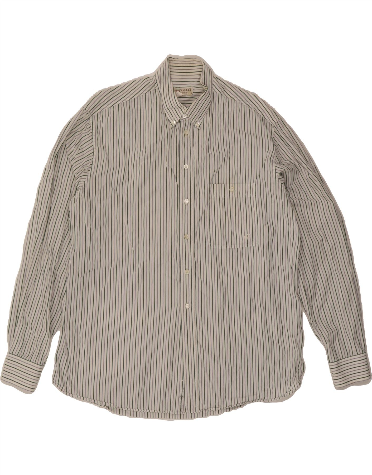 - Descrição da IA: Esta camisa Gucci usada, confeccionada na Itália, apresenta um clássico padrão listrado em algodão branco. O design de mangas compridas com botões inclui decote com gola e punhos abotoados. Acentuada com botões e detalhes sutis do logotipo, esta camisa de corte regular oferece estilo e conforto. A camisa também possui bolsos práticos e tipo xadrez. Rotulado como tamanho 17 1/2, é uma adição atemporal ao guarda-roupa de qualquer cavalheiro. O preço recomendado é de £ 80,50.