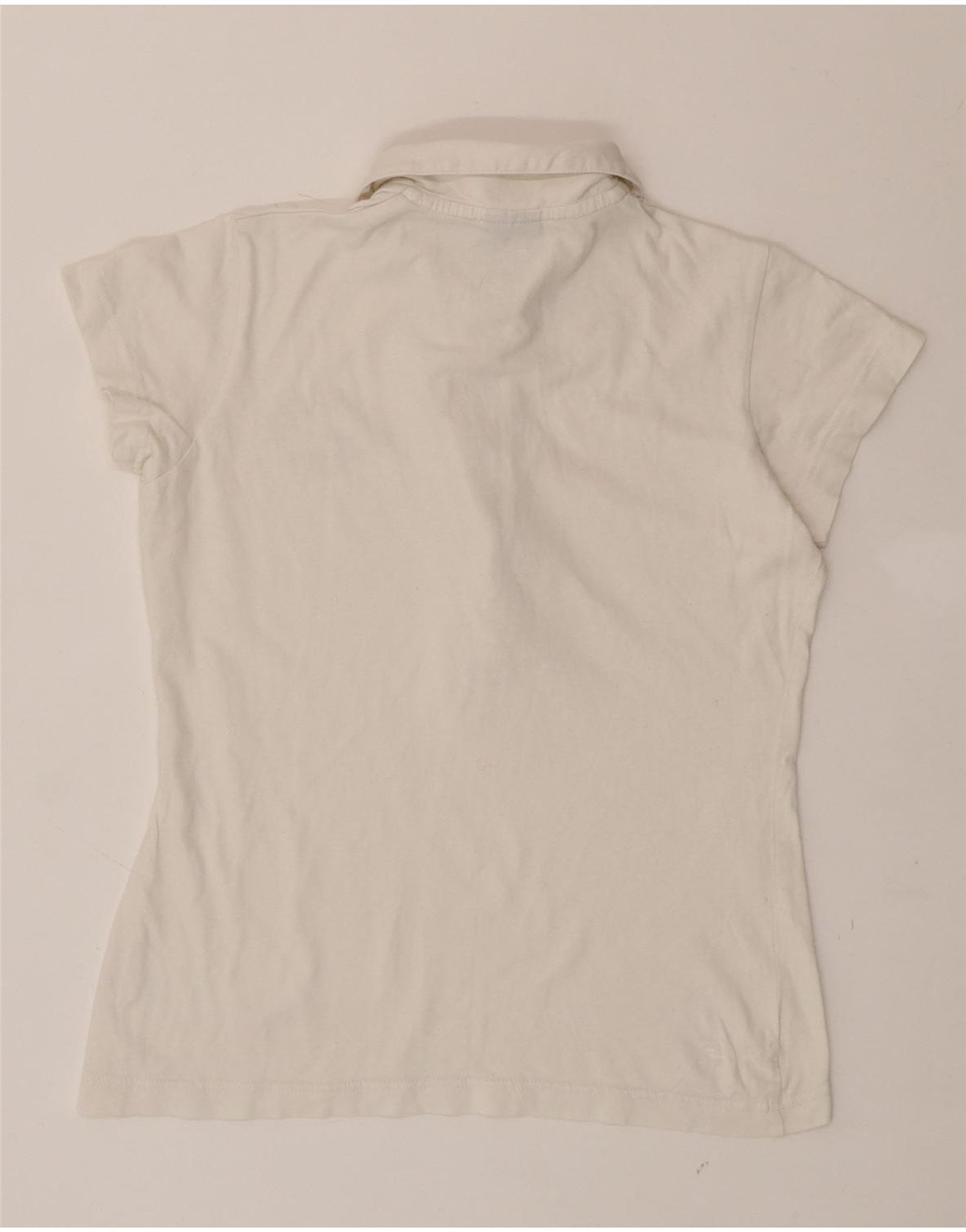 - Descrição da IA: Esta camiseta Nike usada para mulheres apresenta decote com gola e mangas curtas, perfeita para esportes ou uso casual. O tecido de malha off-white oferece um ajuste confortável e regular, acentuado por um detalhe do logotipo. Possui fechamento por botão. O item está em bom estado, com pequenas manchas na frente. O tamanho da etiqueta é L, fabricado na Malásia.