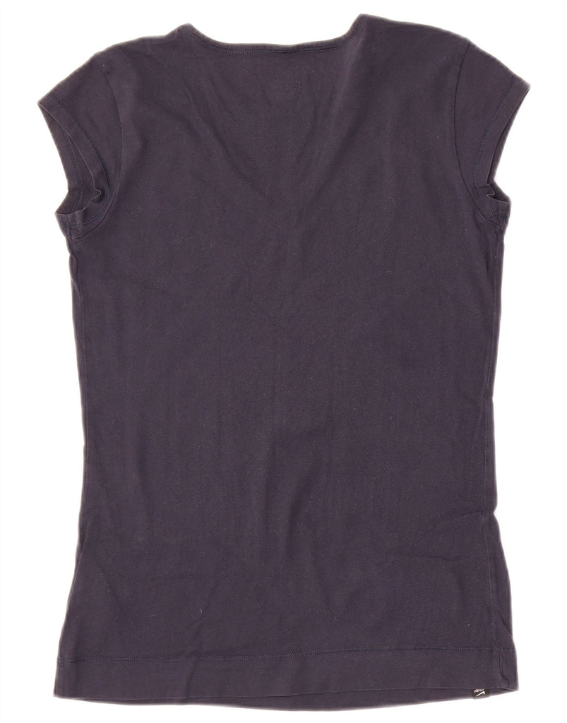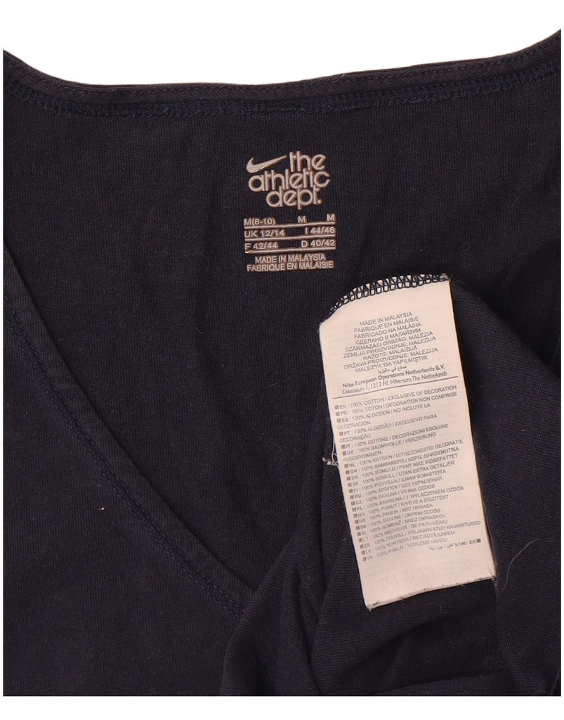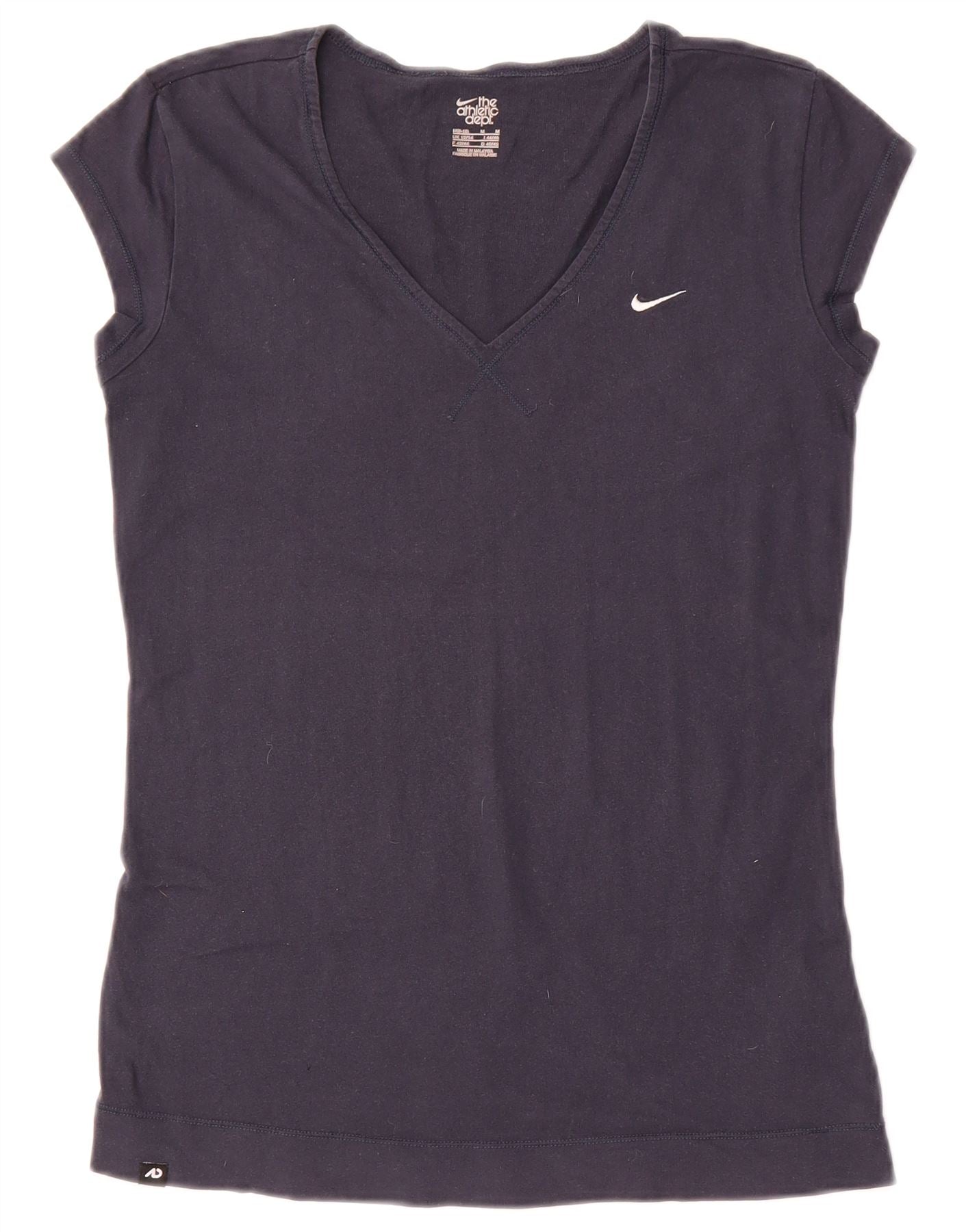- Descrição da IA: Esta camiseta feminina da Nike é confeccionada em jersey macio de algodão azul marinho. O tecido oferece textura leve e respirável, garantindo conforto. Possui decote em V lisonjeiro e mangas curtas clássicas. Um ajuste regular proporciona um estilo de pulôver fácil. O icônico logotipo da Nike adiciona um detalhe distinto da marca.