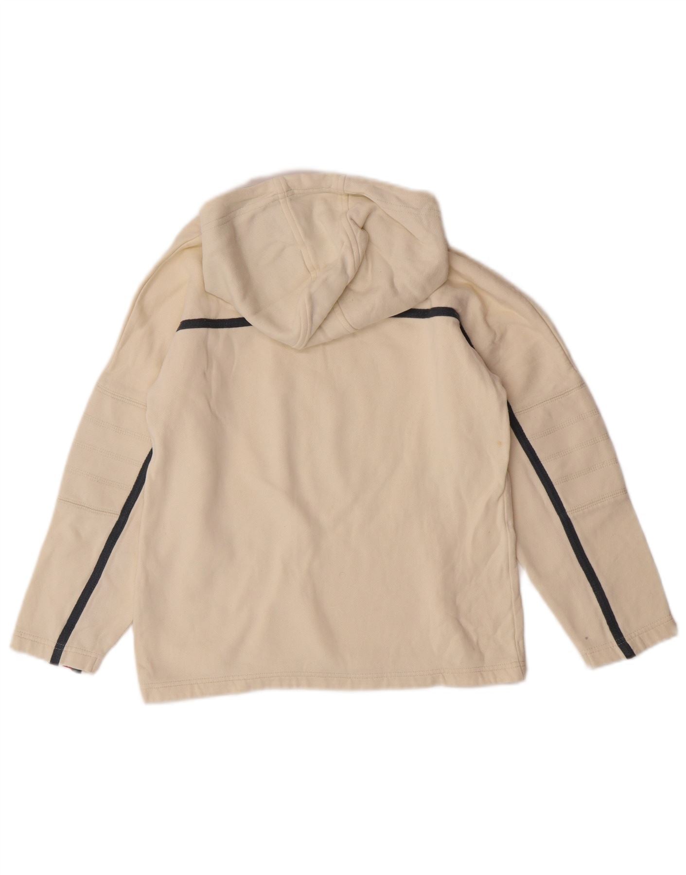 - Descrição da IA: Este moletom com capuz para meninos da Champion é confeccionado em tecido macio de malha 100% algodão. Sua cor off white é acentuada com ousadas listras vermelhas e marinho no peito e nas mangas. Um gráfico proeminente '19' e o logotipo da Champion aparecem na frente. O design com capuz e mangas compridas oferecem calor e conforto. Este estilo pulôver oferece um ajuste regular para uso diário.
