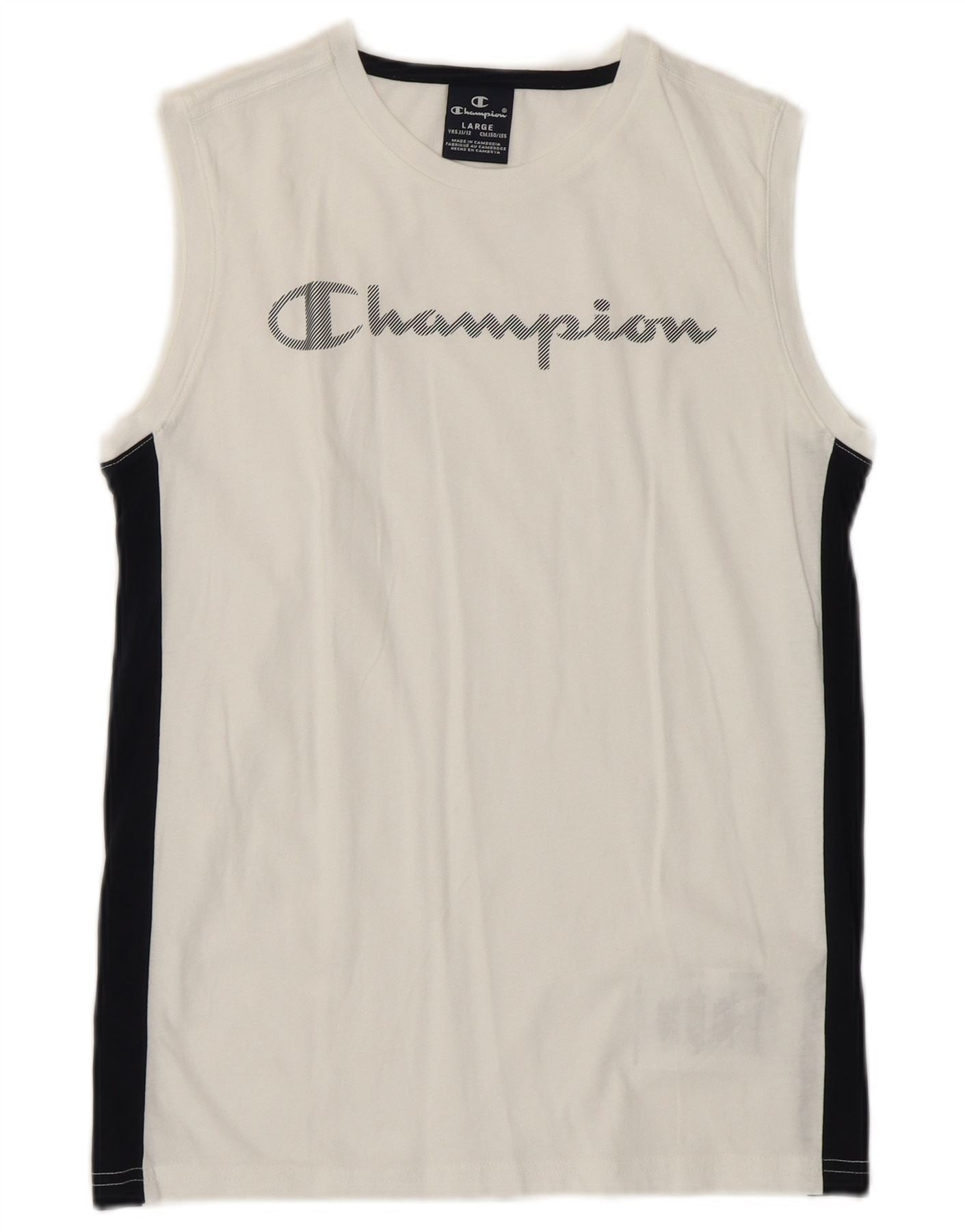 - Descrição da IA: Este colete masculino Champion é confeccionado em jersey de algodão branco respirável. Possui gola redonda clássica e design sem mangas para facilitar os movimentos. O ajuste regular garante conforto, enquanto o fecho pulôver facilita o uso. Um logotipo gráfico adiciona um toque esportivo a esta blusa versátil.