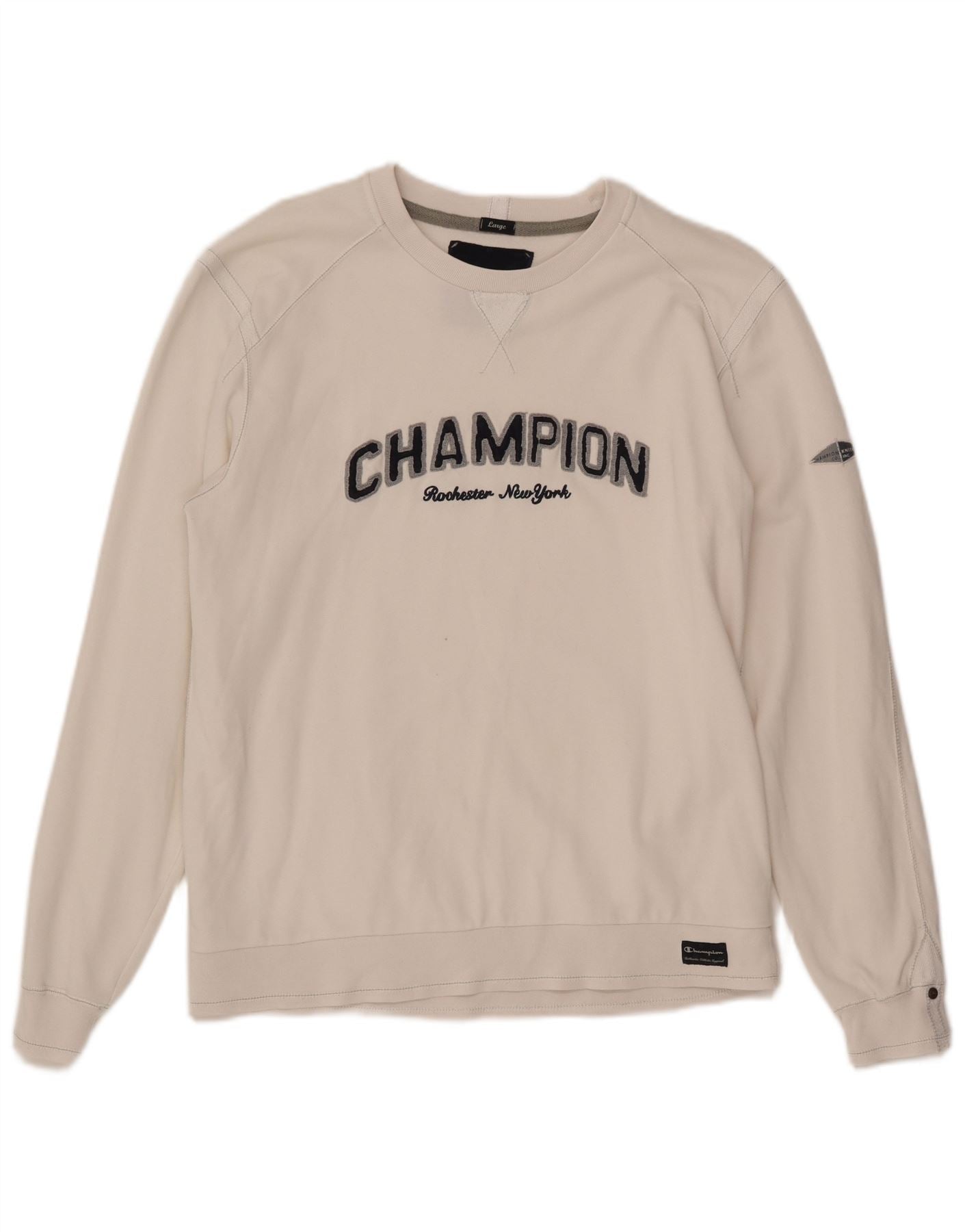 Home > Roupas de campeão vintage > masculino > Moletons > CHAMPION Suéter gráfico masculino grande branco