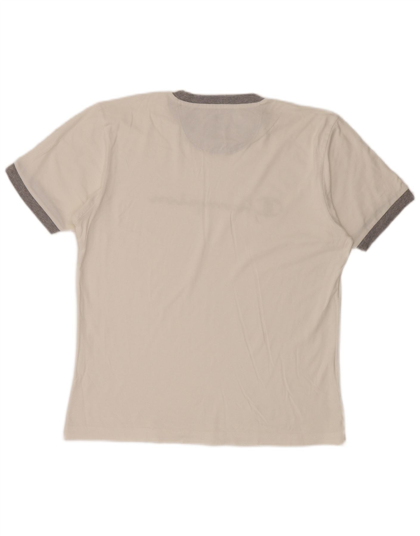 - Descrição da IA: Esta camiseta gráfica masculina Champion é confeccionada em tecido jersey branco macio. Apresenta uma textura suave. A gola redonda é acentuada com um acabamento cinza contrastante. As mangas curtas também apresentam punhos cinza combinando. Oferece um ajuste regular confortável. Um logotipo proeminente da Champion está impresso na frente. Este pulôver de estilo retro é simples, mas distinto.