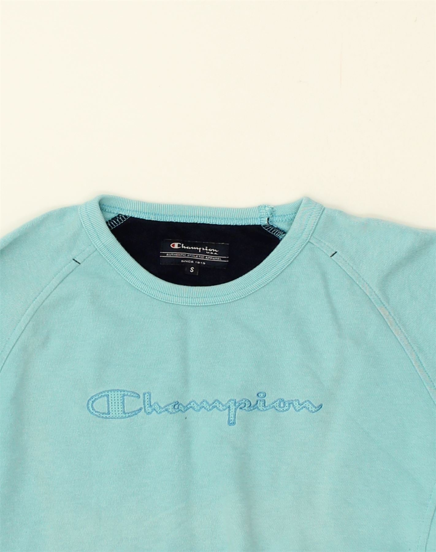 Home > Roupas de campeão vintage > mulheres > Moletons > CHAMPION moletom feminino gráfico jumper UK 10 pequeno algodão azul