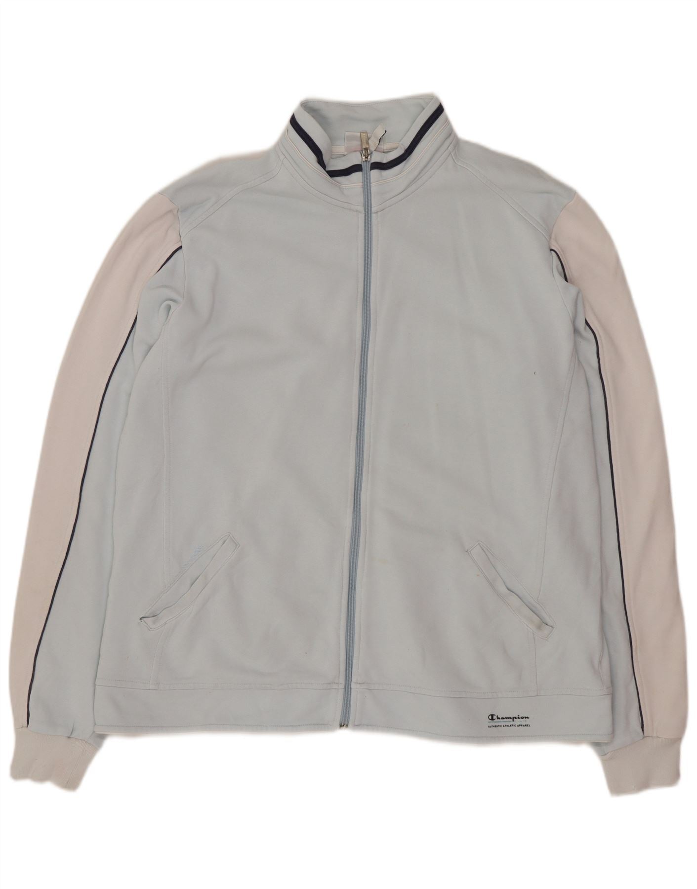 - Descrição da IA: Esta jaqueta feminina Champion é confeccionada em tecido macio e mesclado. Possui gola alta e fecho de correr completo para uso versátil. O design colorblock combina um corpo principal azul com mangas compridas off white. Detalhe de debrum escuro percorre as mangas. Os pulsos com punhos e o ajuste regular garantem conforto. Um logotipo sutil da marca completa o estilo atlético.