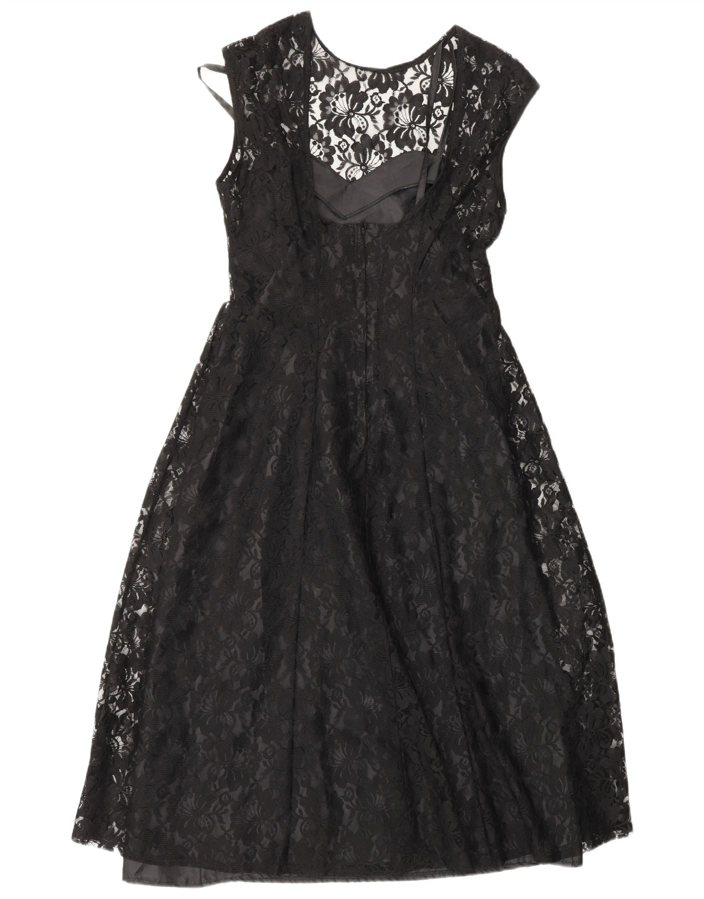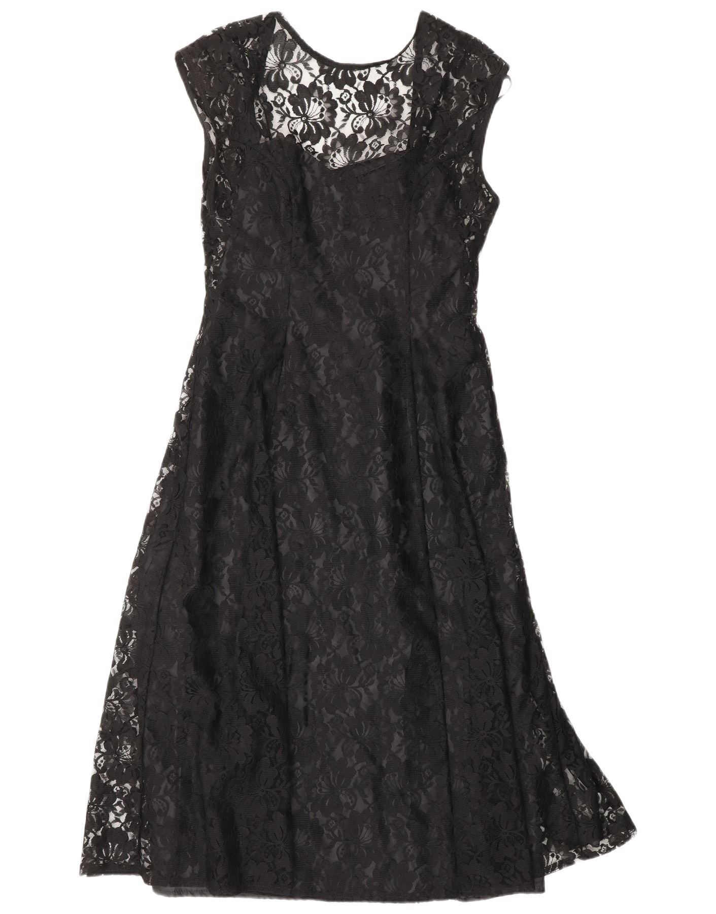 Vestido feminino clássico evasê UK 12 médio preto floral nylon