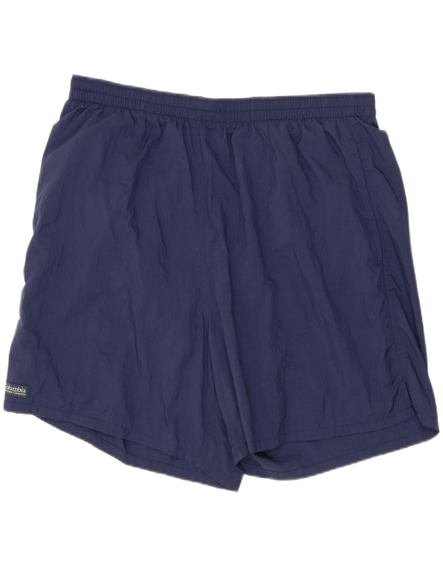 - AI Description: This Columbia mens casual shorts are crafted from lightweight navy blue nylon, offering a smooth, woven texture. They feature a comfortable polyester lining. The pull-on style includes an elasticated waist for an easy, regular fit. Practical pockets are integrated into the design. A subtle Columbia logo provides a signature accent. These shorts are ideal for sports or casual wear.