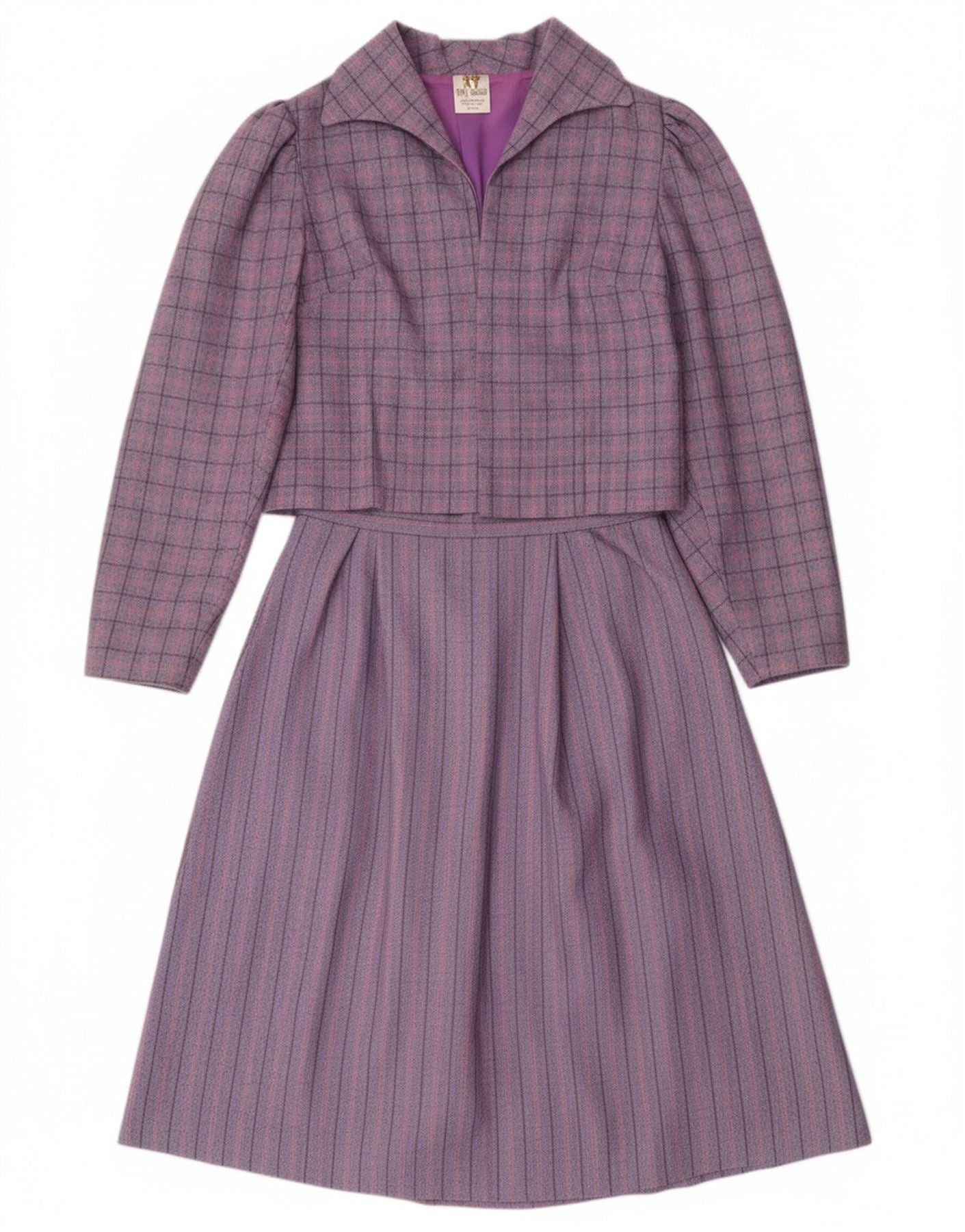 - Descrição da IA: Este conjunto de saia de 2 peças vintage para meninas apresenta um tweed xadrez roxo em um corte regular. Confeccionado na Irlanda com 50% poliéster e 48% lã, o conjunto inclui uma jaqueta de gola e manga comprida com fecho de botão e ombreiras. A saia forrada completa o look clássico. O padrão xadrez adiciona um toque de estilo atemporal.