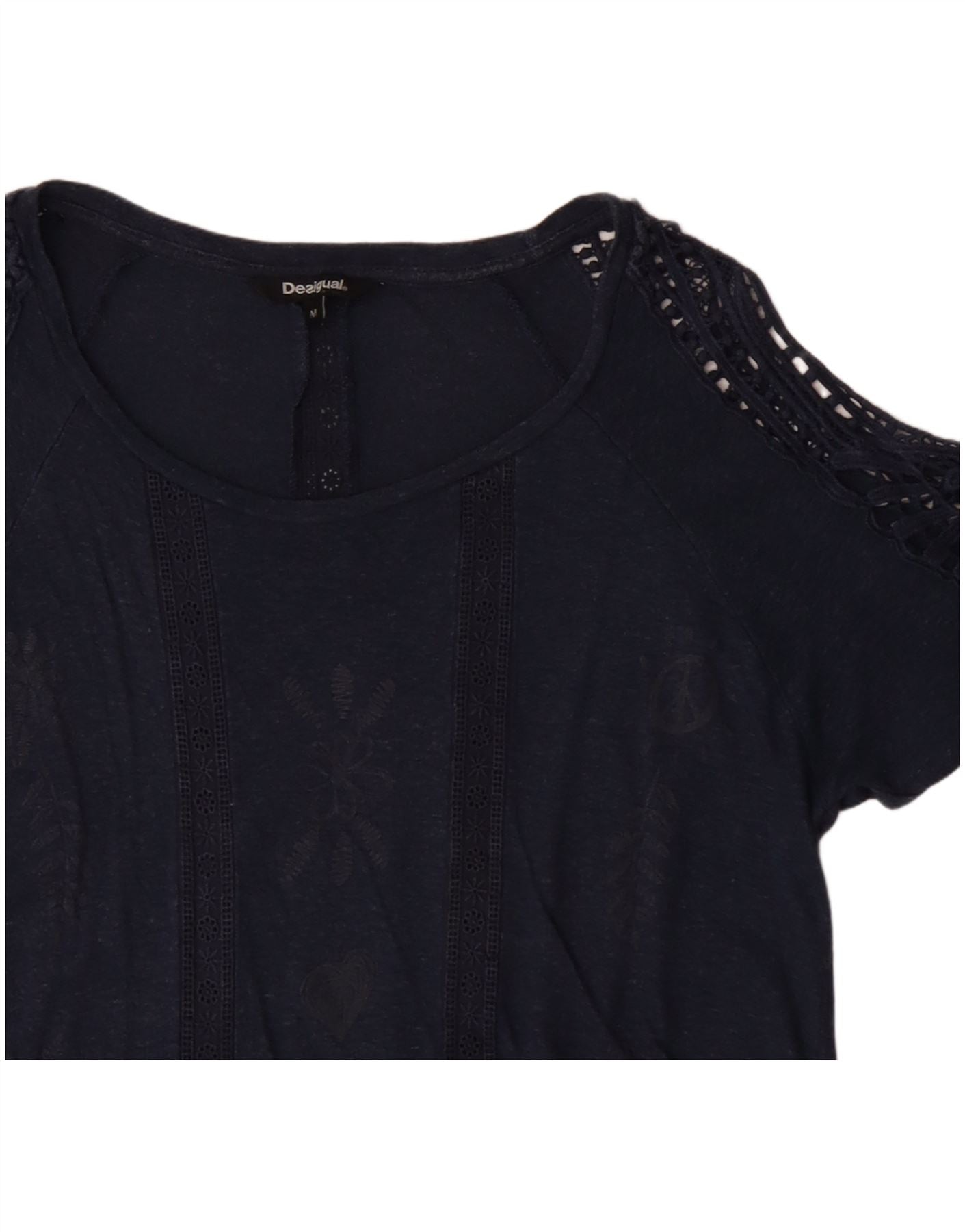 - Descrição da IA: Esta camiseta feminina Desigual é confeccionada em tecido de malha azul suave. Possui decote redondo clássico e mangas curtas. Gráficos florais intrincados adornam a frente, acrescentando interesse visual. Delicados detalhes em crochê realçam os ombros e as mangas. O ajuste regular oferece um uso confortável. Este estilo pulôver incorpora uma estética boêmia, perfeito para um visual descontraído, mas elegante.